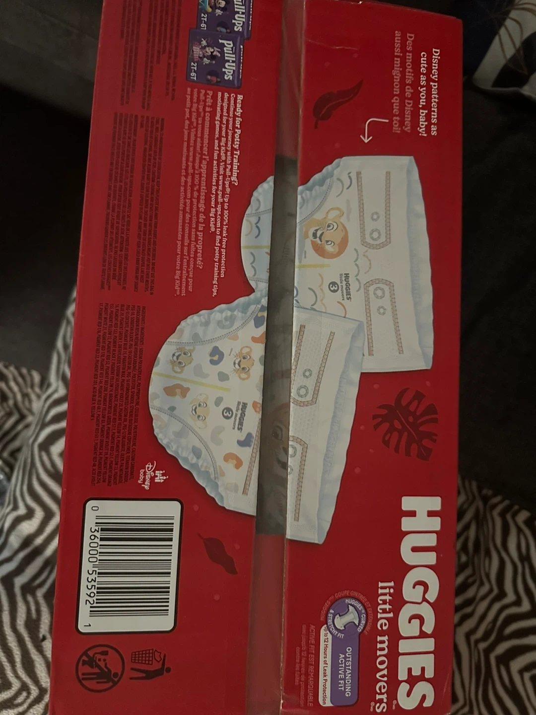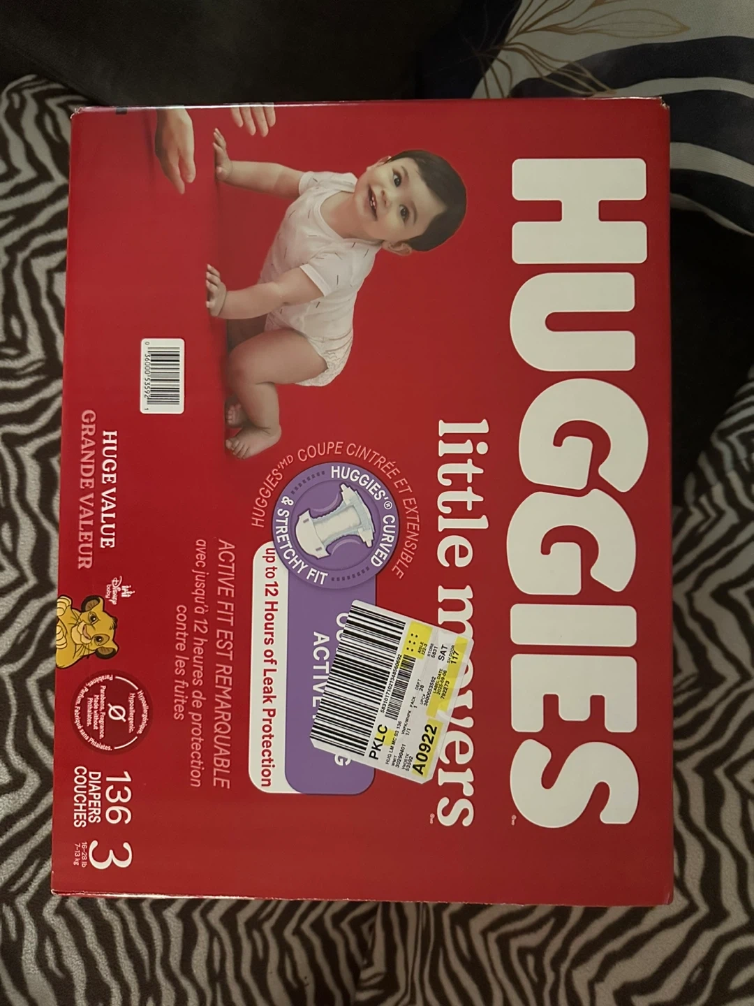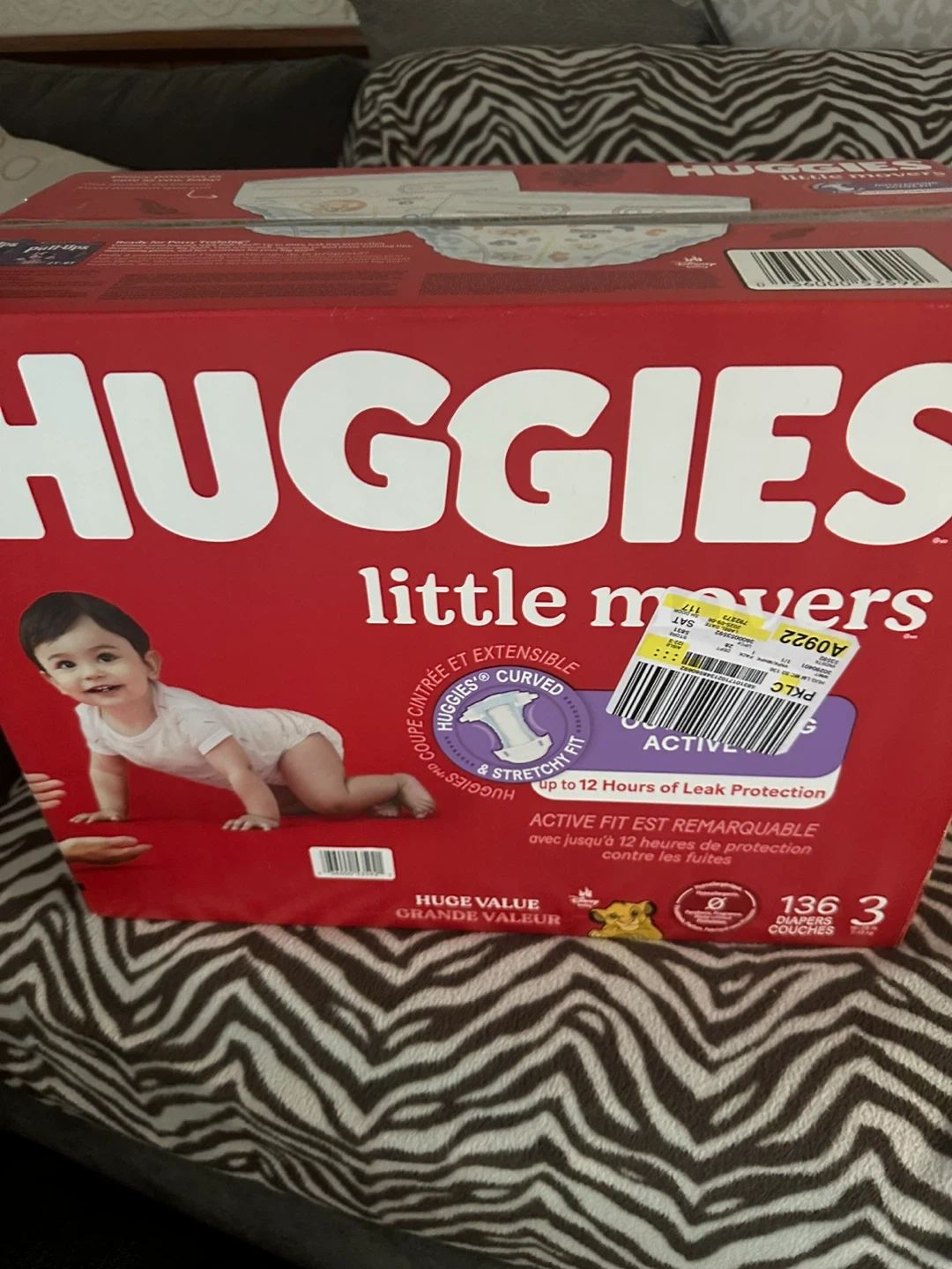Brand new, my baby size of diaper change it never open and I Lost receipts so can’t return too. Selling a box of Huggies Little Movers diapers, size 3. There are 136 diapers in the box. These diapers have a stretchy fit and provide up to 12 hours of leak protection. They also feature Disney patterns!
