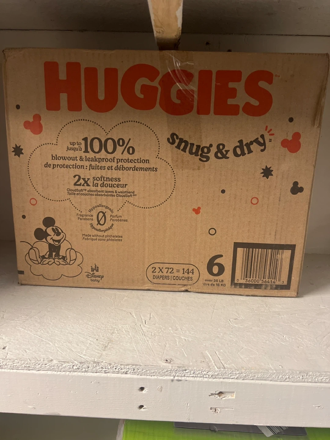 94Selling a box of Huggies Snug & Dry diapers, size 6. The box contains 144 diapers (2 packs of 72). These diapers offer up to 100% blowout and leakproof protection and have 2x softness with CloudSoft absorbent layers. They're also hypoallergenic and made without phthalates, perfect for your little one!