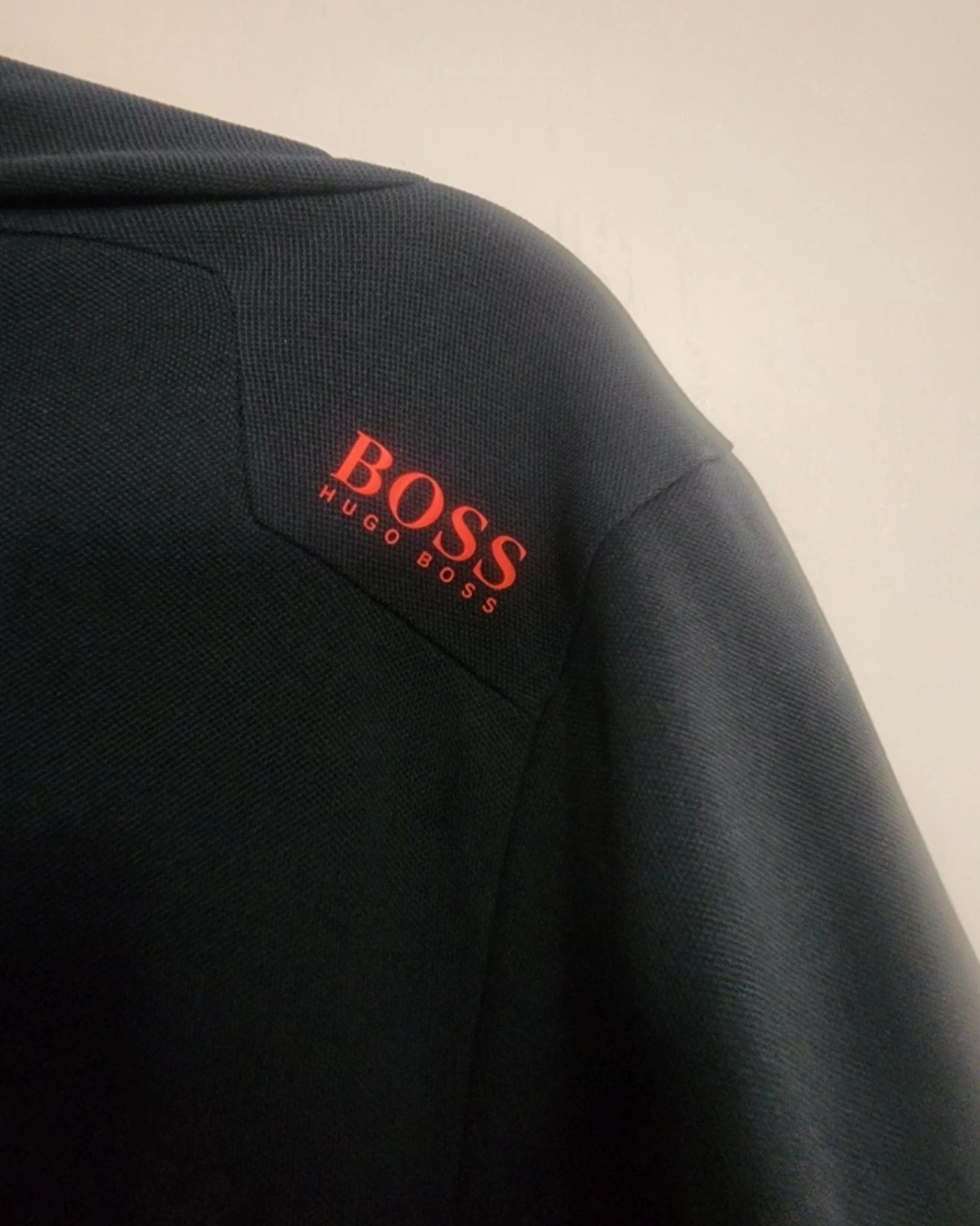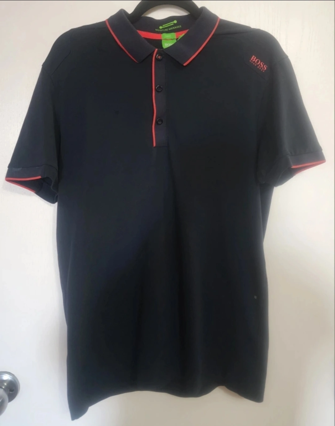 42Hugo Boss Polo Shirt Navy Blue with Red Trim In brand new condition with no stains, rips, frays, or missing buttons Size: Large Pickup only Cash Only Thank You very much