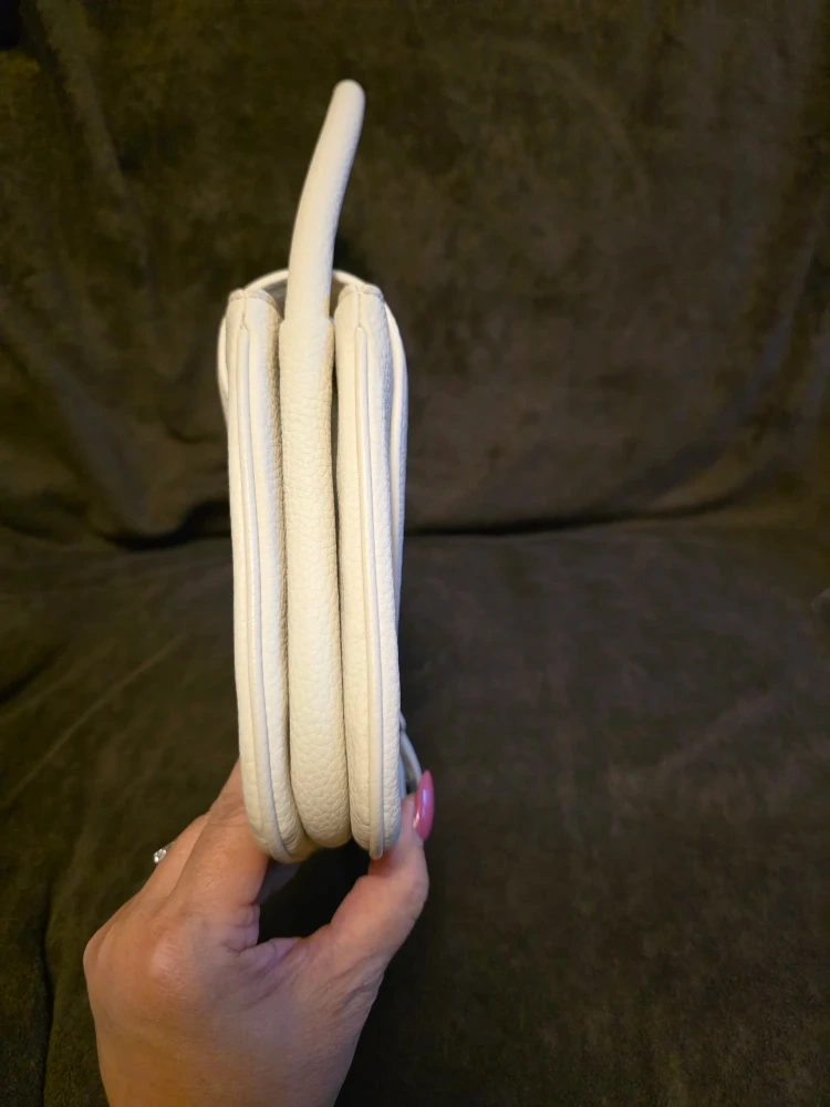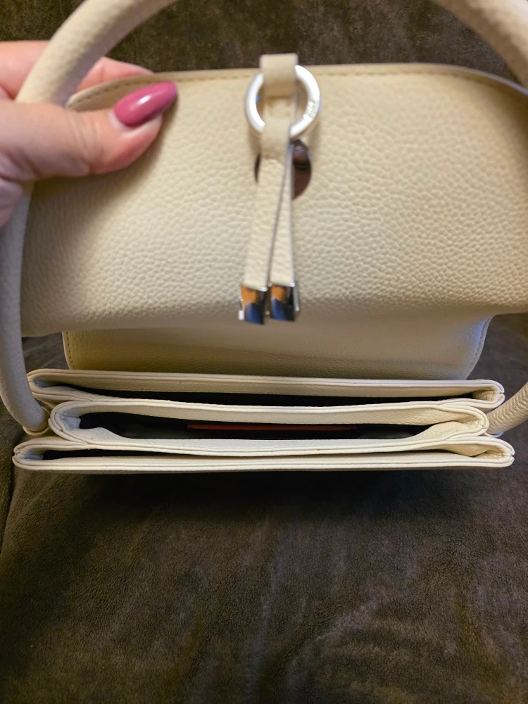 10Chic cream leather bag by HUGO. Pre-loved. Please review photos closely for the condition of the bag. There are a few tiny faint scuffs and some faint discolouration on the back of the bag (last two photos). However, the front of the bag and its corners are in almost new condition. 10" x 6.5" x 1.5"