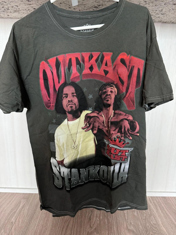 This t-shirt features a graphic of Andre 3000 and Big Boi on the front, and a list of songs from the Stankonia album on the back.