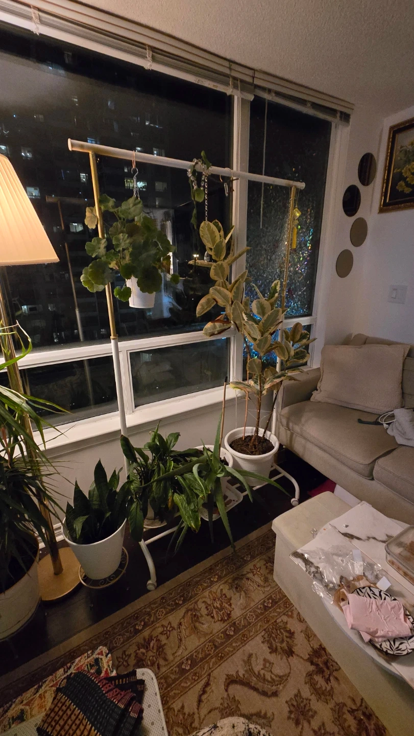 This is an IKEA clothes rack on wheels. I have spray painted some parts gold and used it for hanging my plants