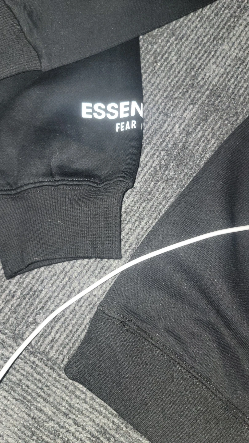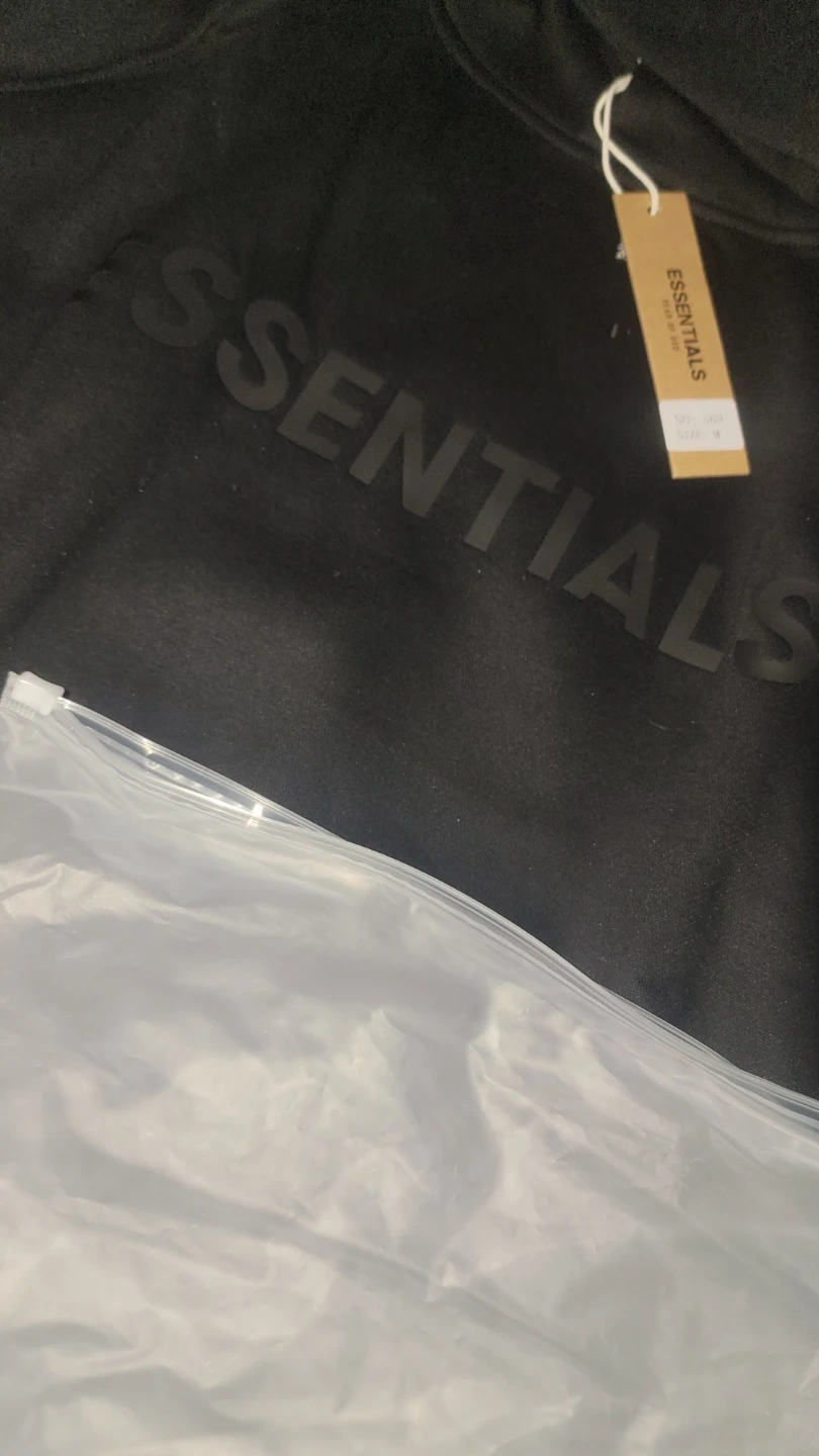 Black Fear of God Essentials hoodie with a logo print. Size medium. Comes with original packaging bag and tag.