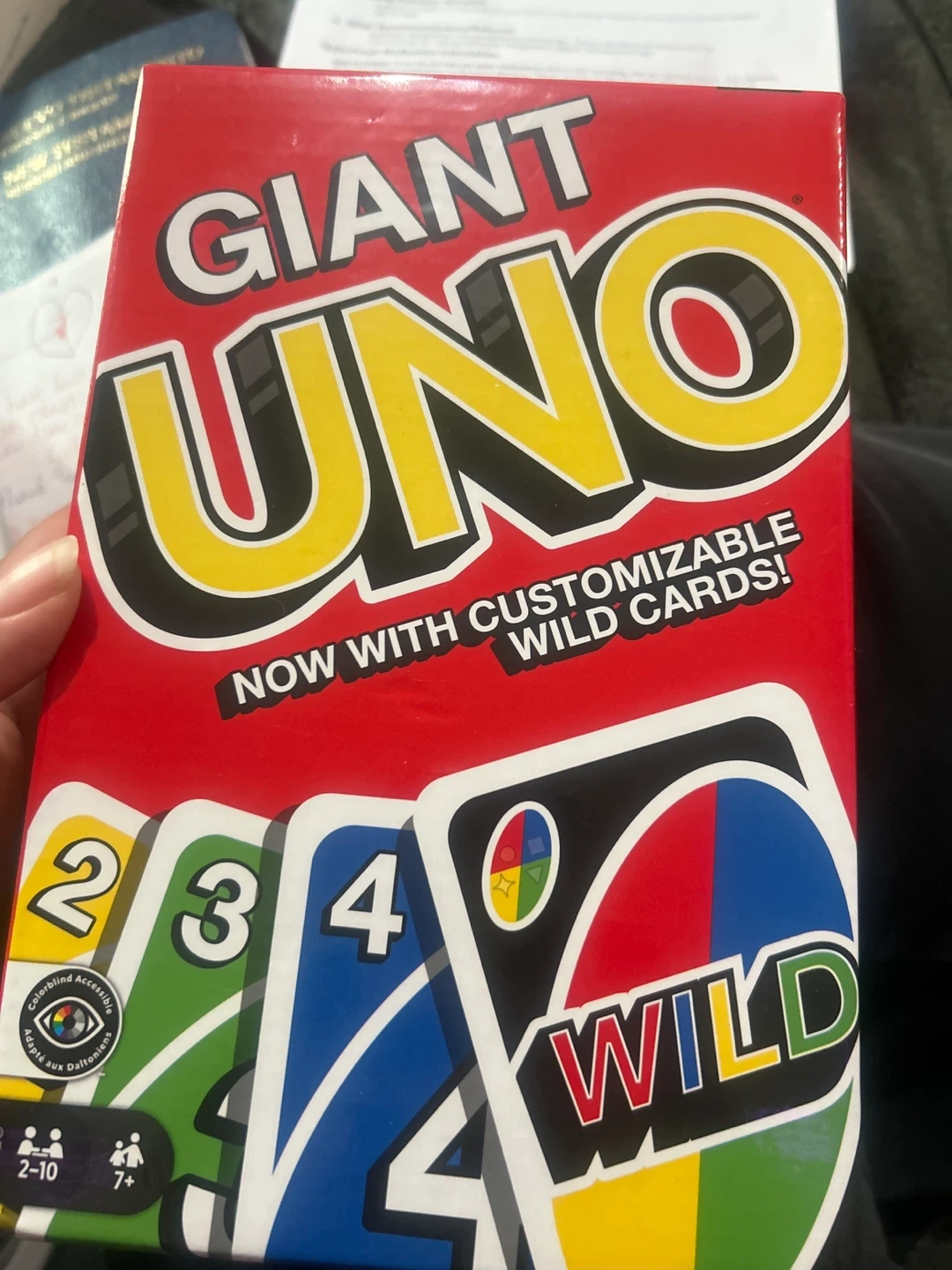 This is the Giant UNO card game, now with customizable wild cards! It's designed for 2-10 players and is suitable for ages 7 and up. The game includes colorblind accessible design elements.