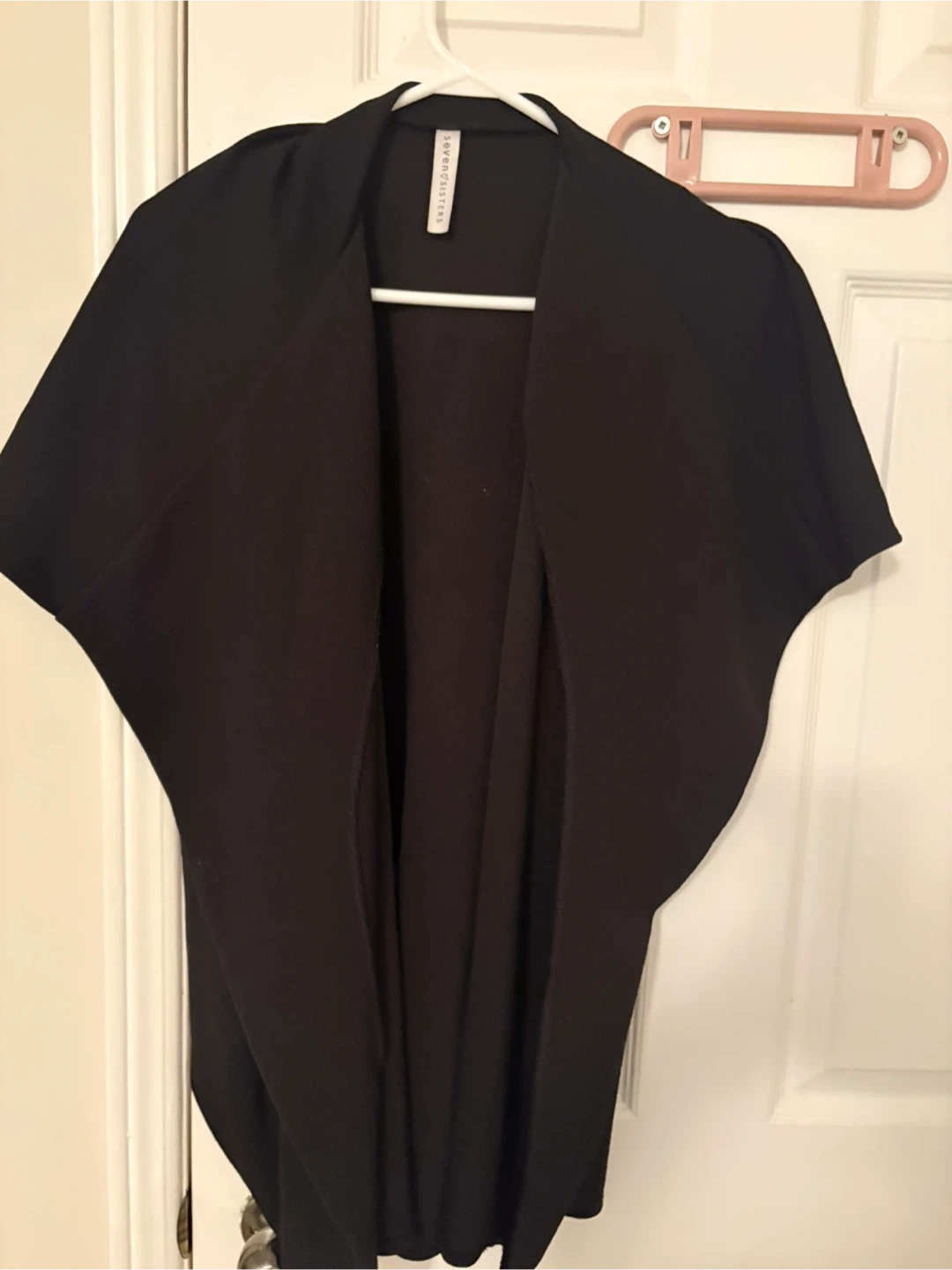 A black sleeveless vest with a waterfall-style front. It's made from a comfortable, flowy fabric. This vest is great for layering over tops.