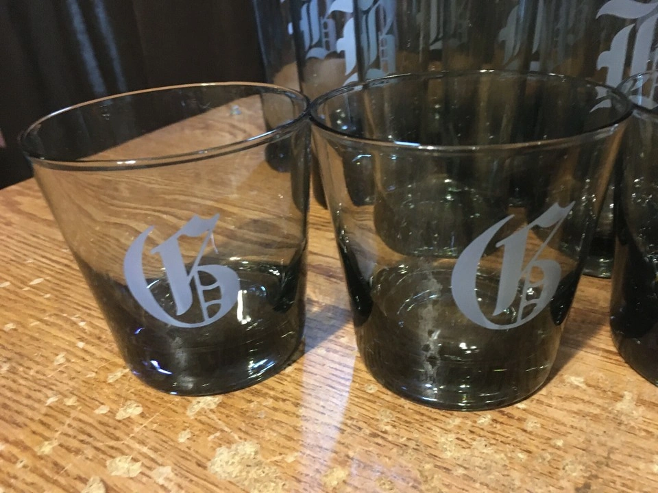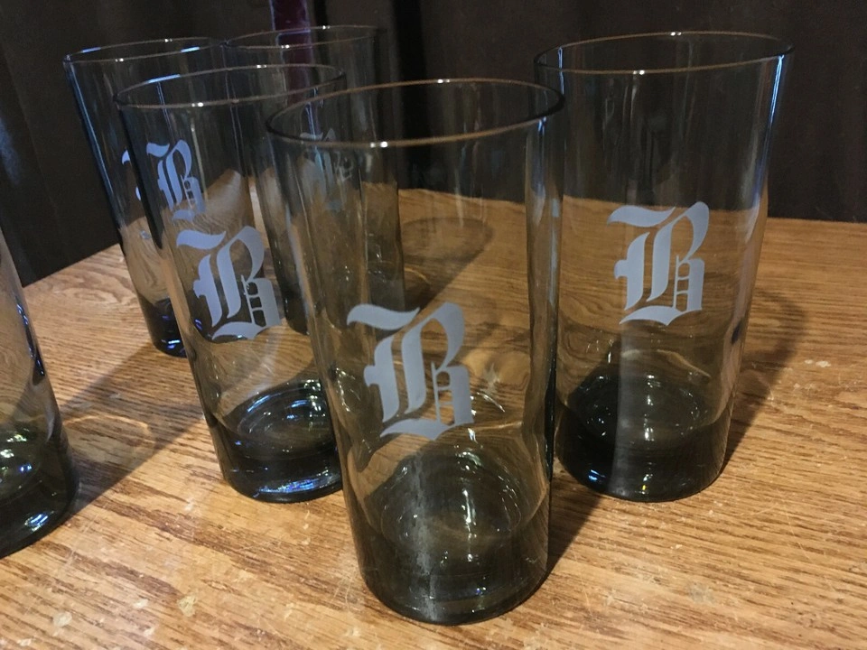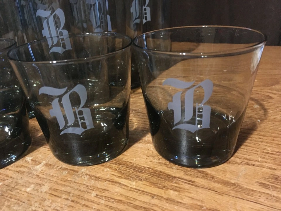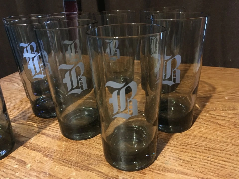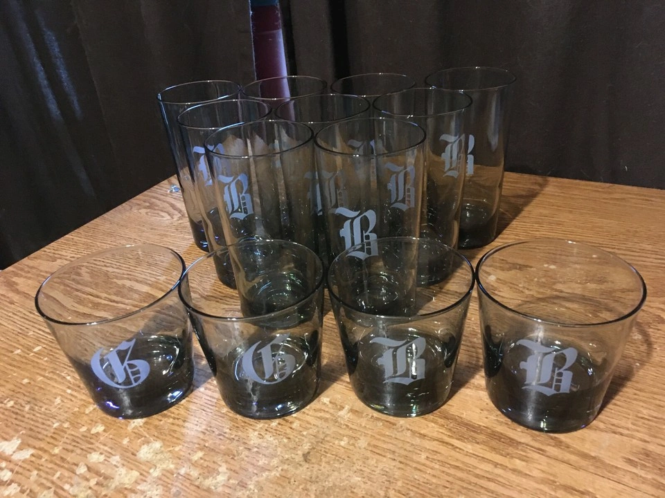 Dark gray glass beverage set. nine tall glasses and four on the rocks glasses. Each piece features a white letter B or R. Vintage and pre-owned. All the glasses are in great condition the nine glasses are about 5 and 1/2 in tall not sure if they are Tumbler or highball glasses eight of those have the letter B or R on them and for on the on the rocks glasses three and a half inches tall have what looks like two R's and two B's. pick up my house