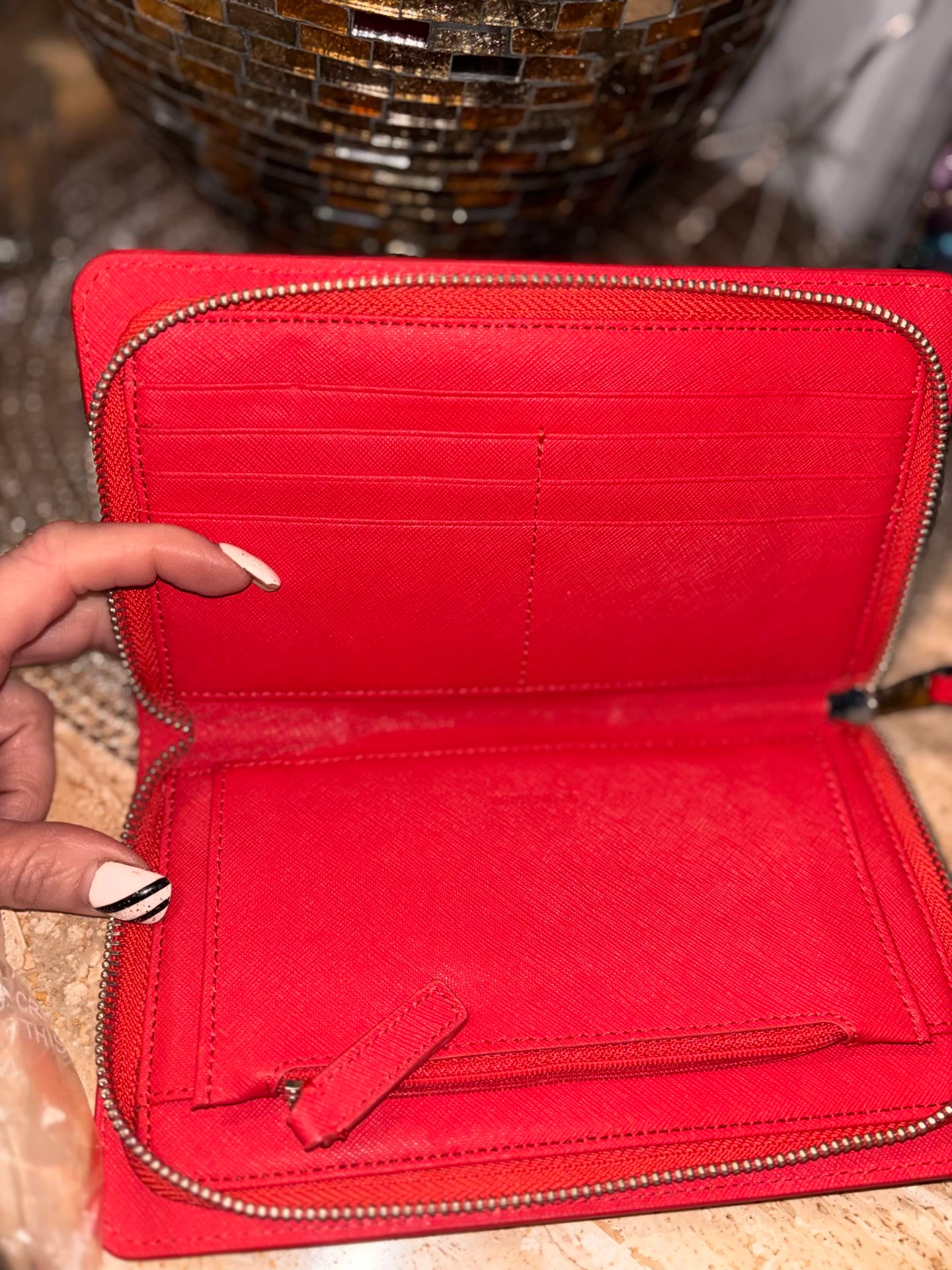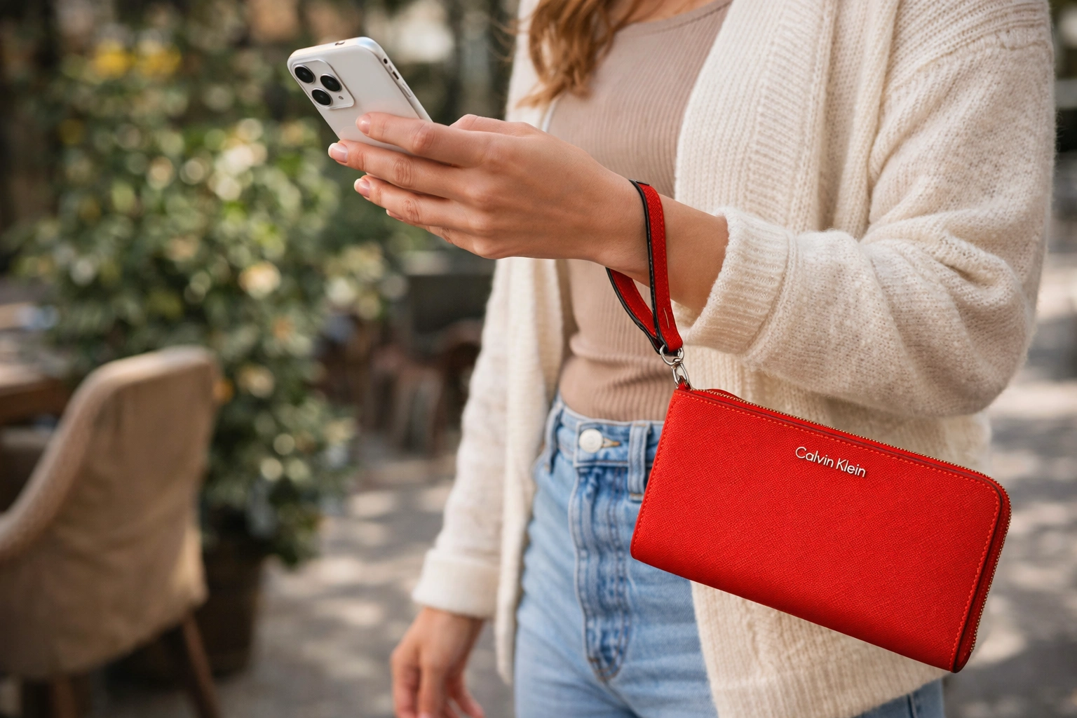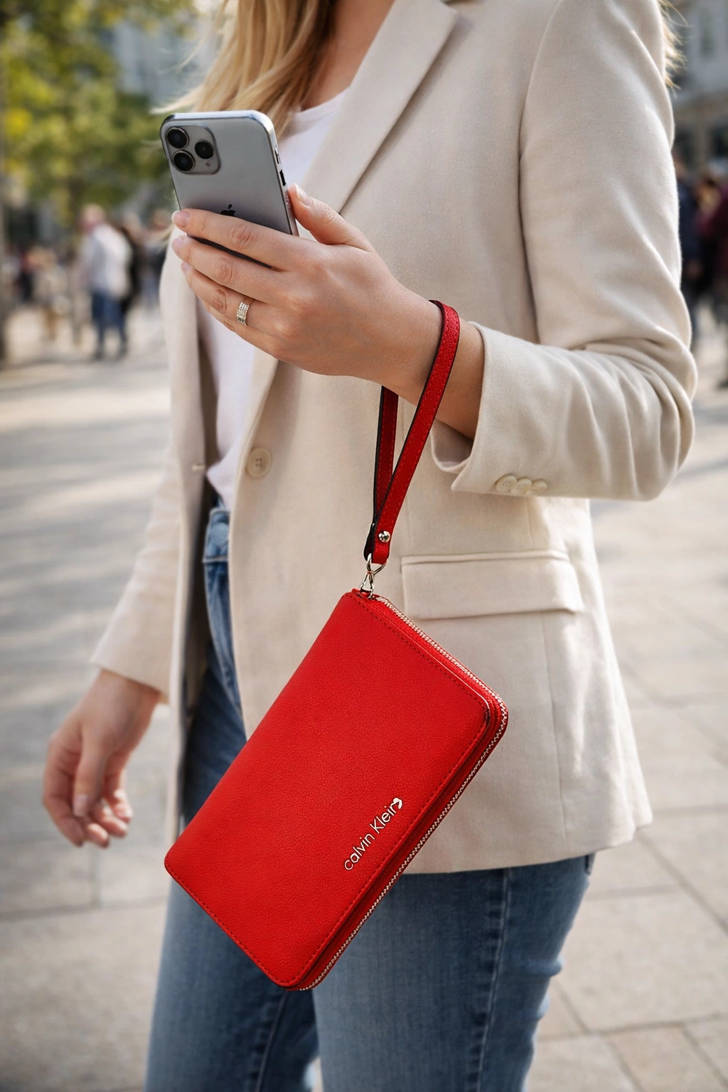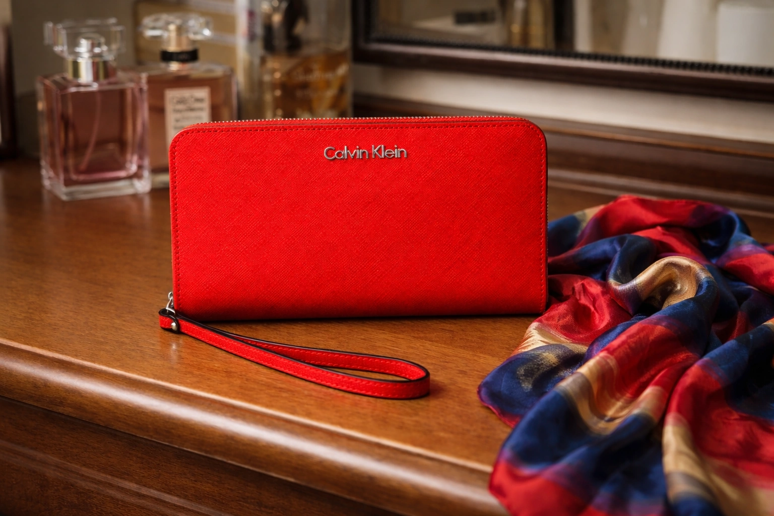 Chic and functional Calvin Klein wristlet wallet in vibrant red saffiano leather. Zip-around style with multiple card slots, bill compartments, and a secure interior zip pocket. Structured, durable leather with wrist strap for easy carry. Condition: New without tags. Material: Saffiano leather. Size: Approx. 8” L x 5” H. Perfect for everyday use or gifting.