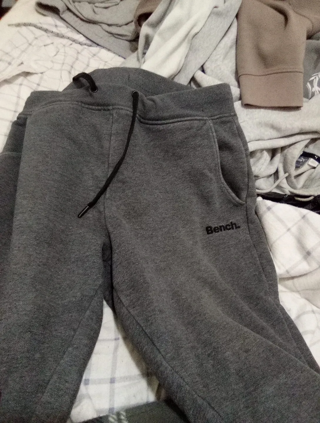 Grey Bench jogger sweatpants. These pants feature a drawstring waist and side pockets. Made from a comfortable fleece material.
