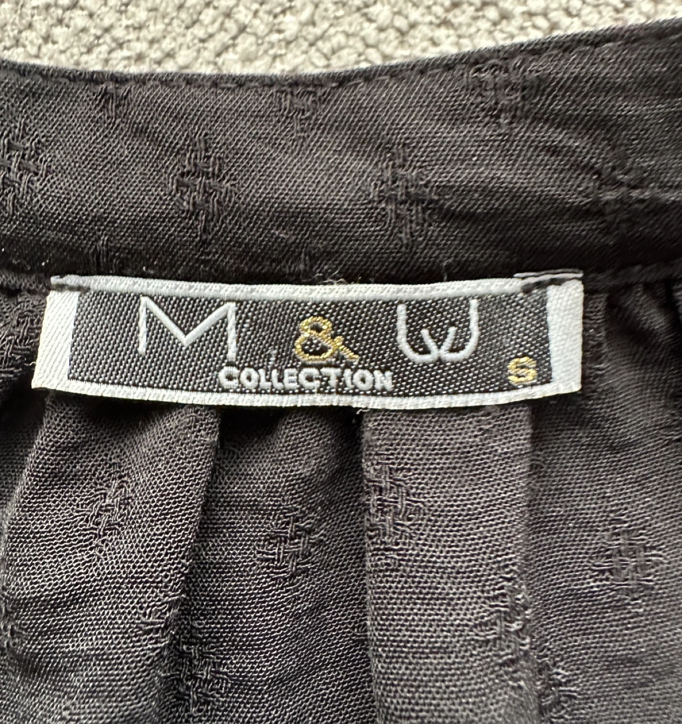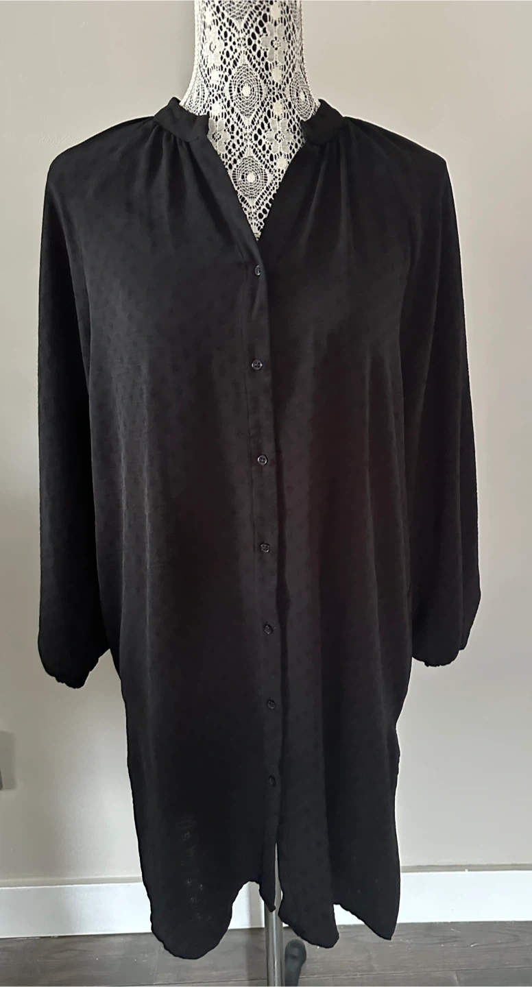 This M&W Collection shirt dress is black with a subtle textured pattern. It features a button-up front and a collared neckline. It's a size small. The fabric has a unique raised diamond pattern throughout.