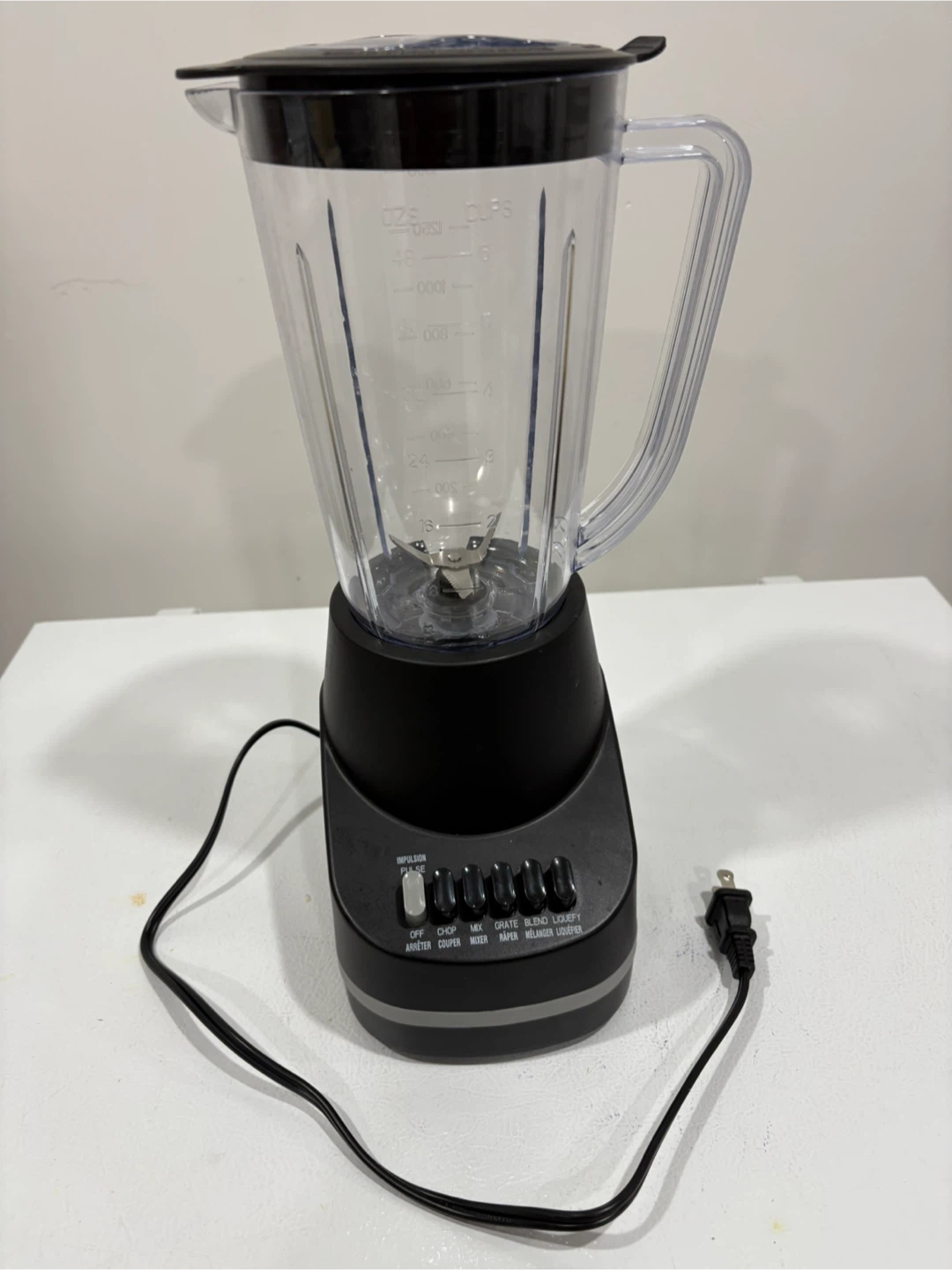 Selling a black blender in good condition. It has multiple settings including chop, mix, grate, blend, and liquefy. Perfect for making smoothies or other blended drinks!