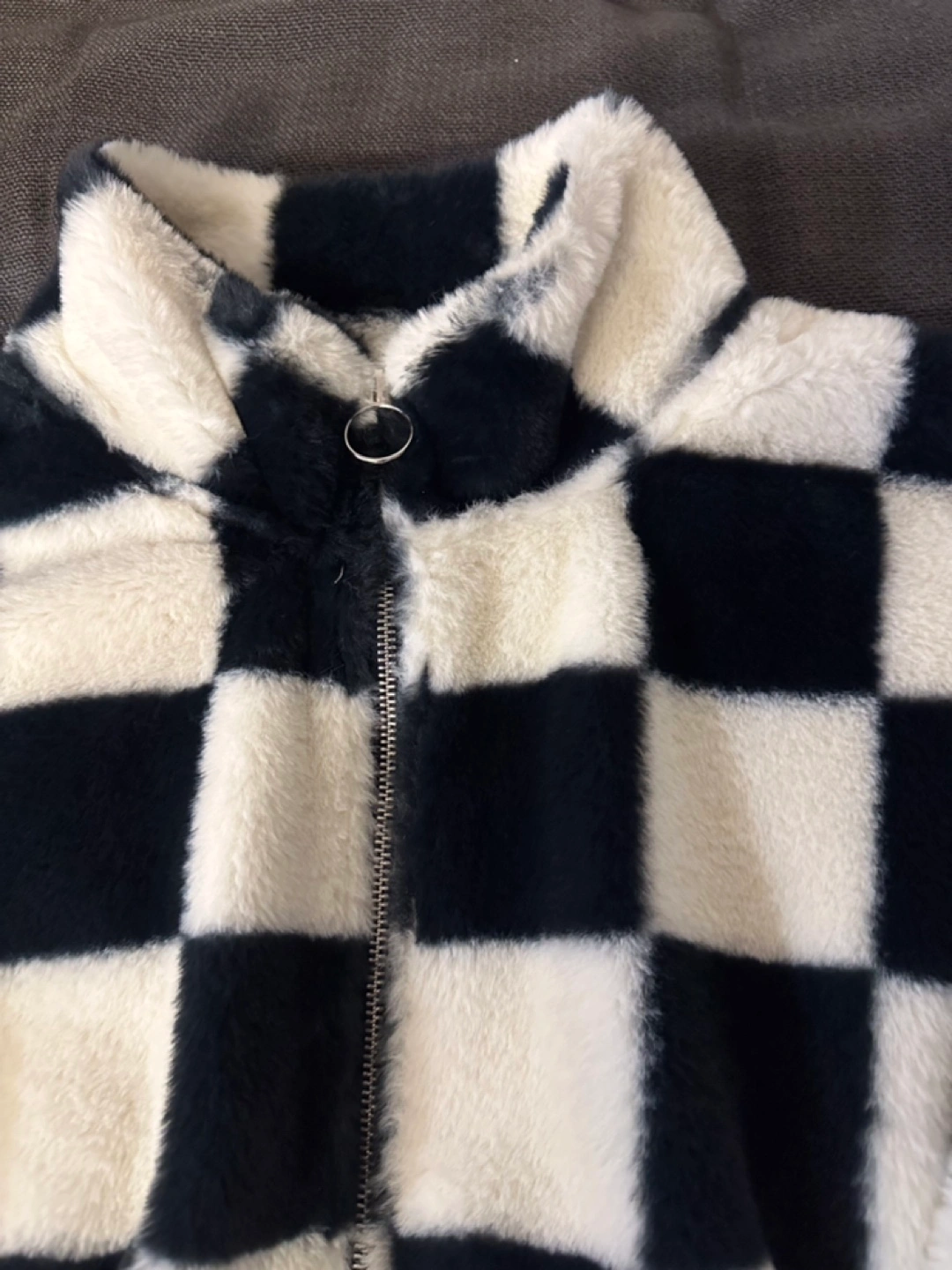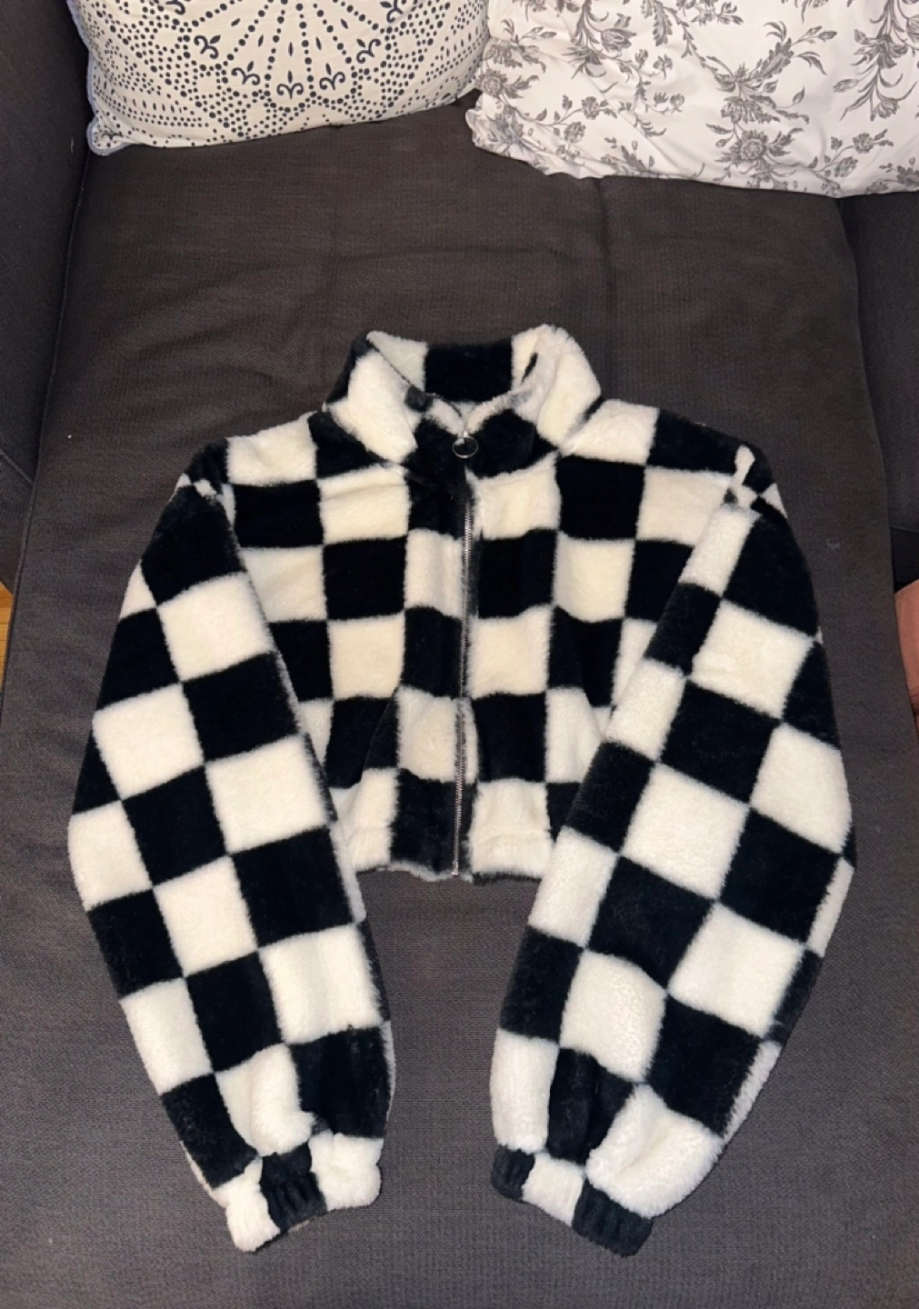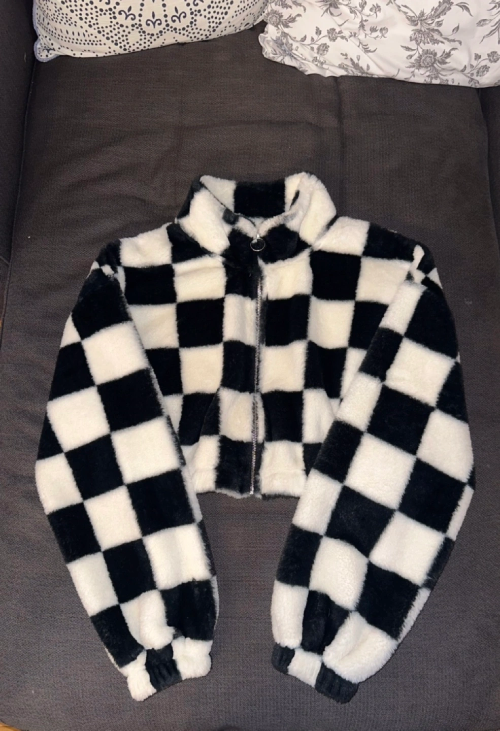 Cropped, black and white checkered fuzzy jacket. Full zip closure. Size Large, (I'm a size "s", wore this once as an oversize)