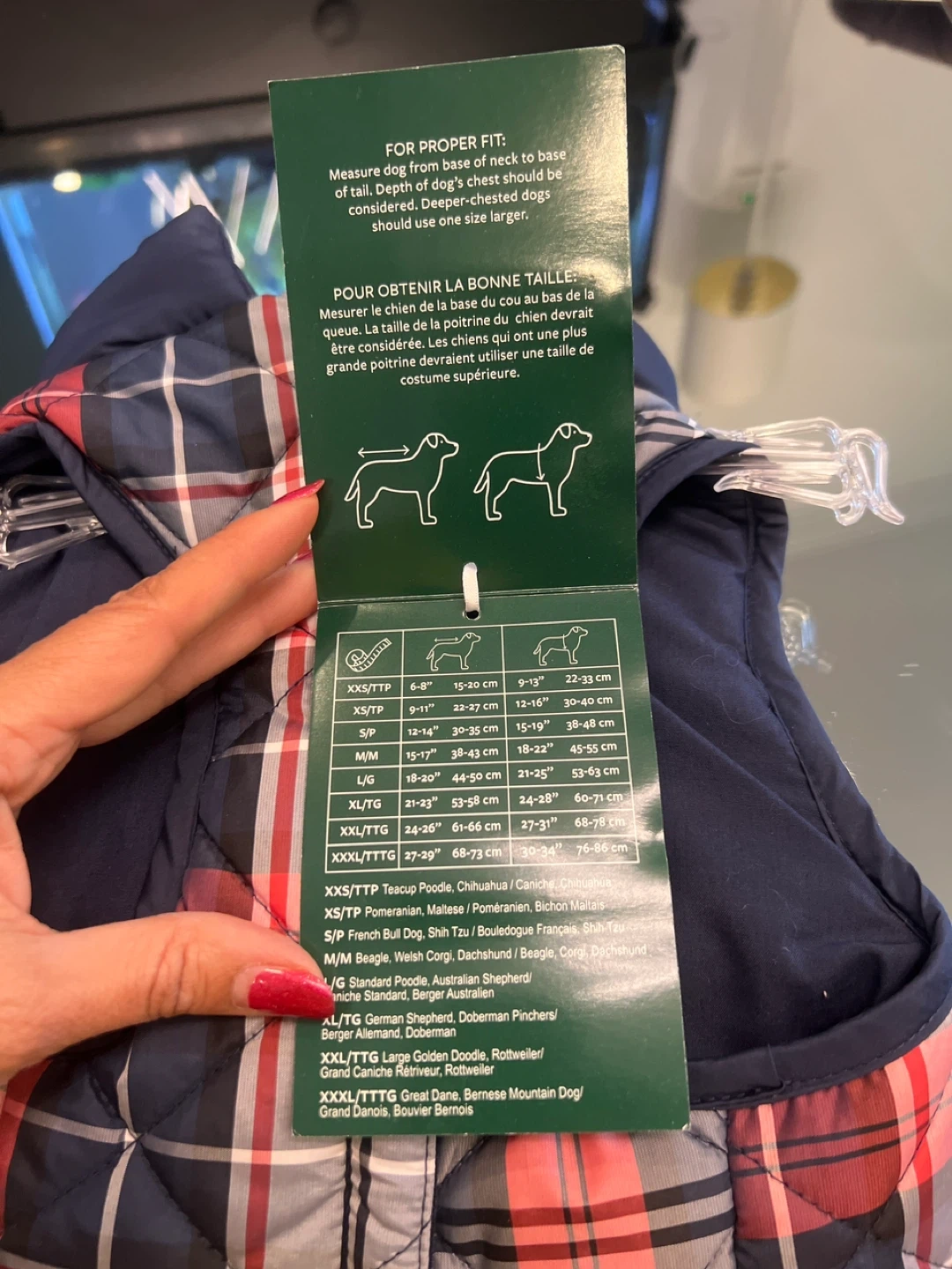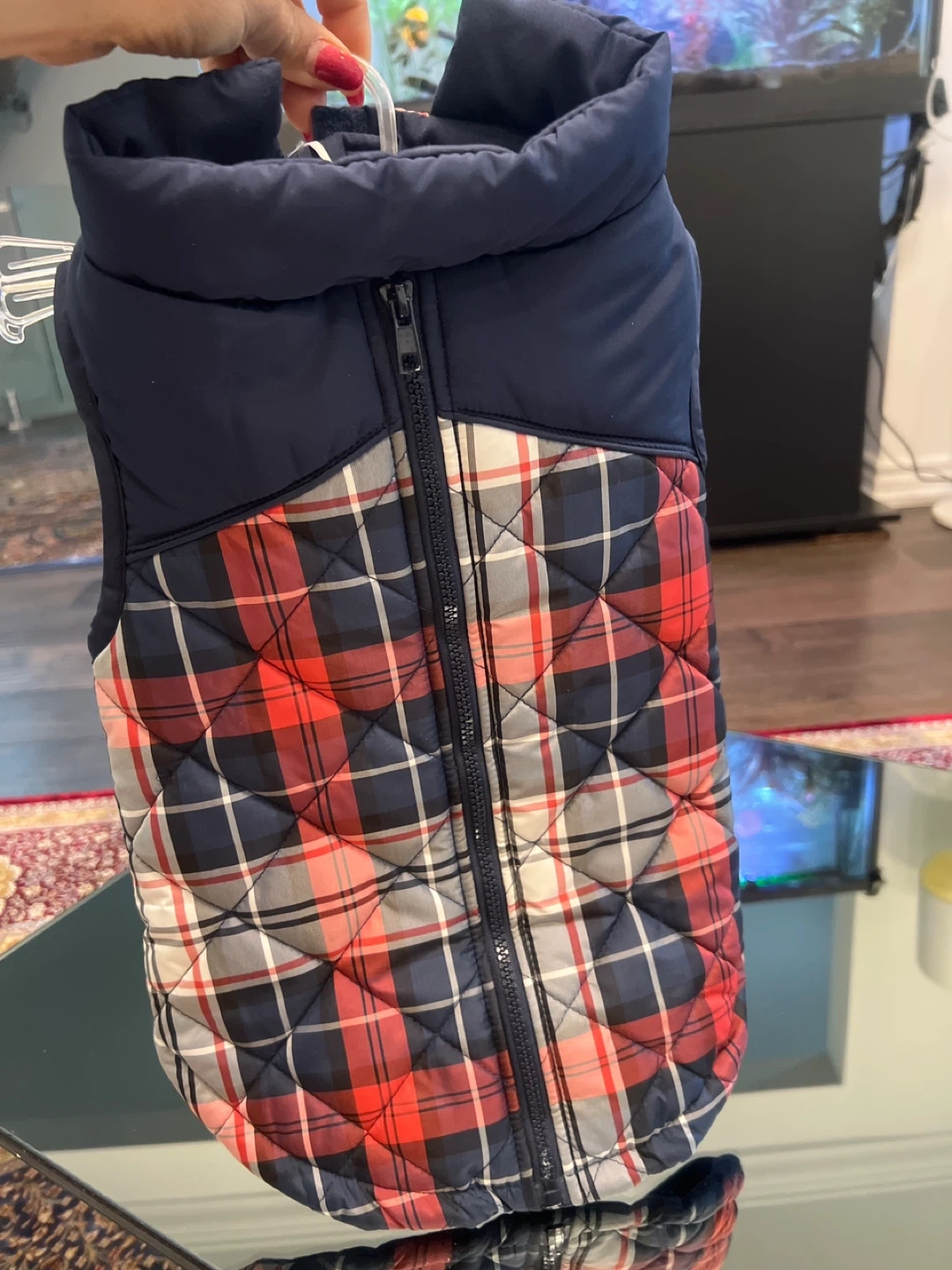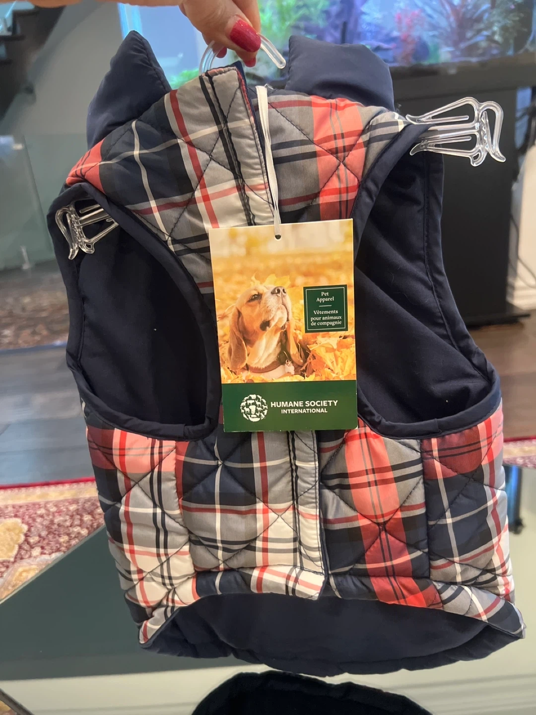 Keep your furry friend warm and stylish with this Humane Society dog puffer vest! It's a size medium and features a classic plaid pattern on the lower half and solid navy on top. Perfect for those chilly Canadian walks!