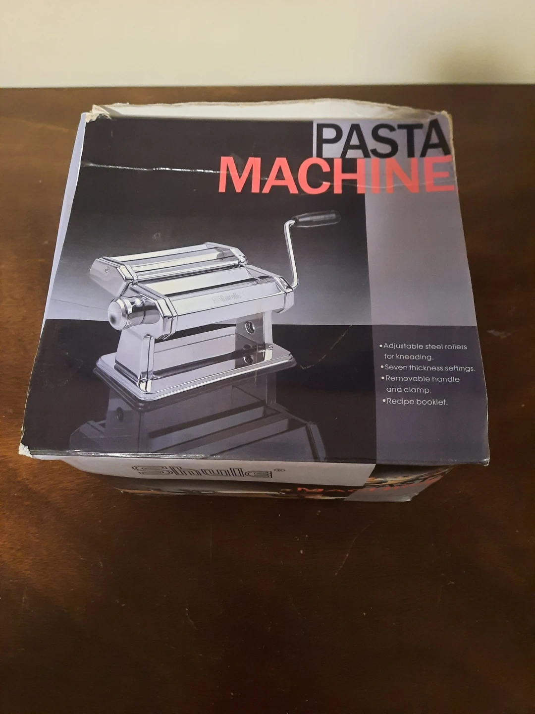 This Shule pasta machine comes with adjustable steel rollers and seven thickness settings. It includes a removable handle and clamp for easy use. A recipe booklet is also provided.
