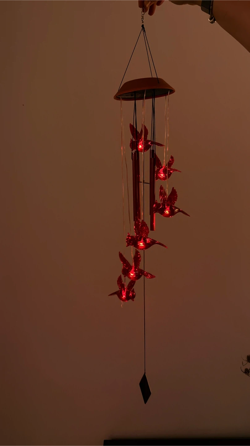 60Add a touch of whimsy to your outdoor space with this lovely hummingbird solar wind chime! The red hummingbirds light up, creating a beautiful and calming ambiance as they sway in the breeze