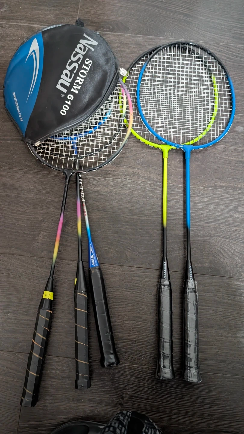 Two Nassau badminton rackets are included, along with a Nassau Storm 6100 racket bag. Two other badminton rackets are also present, one labelled 'Matrix' and another with colourful accents. This set is great for casual play or starting a new sport!