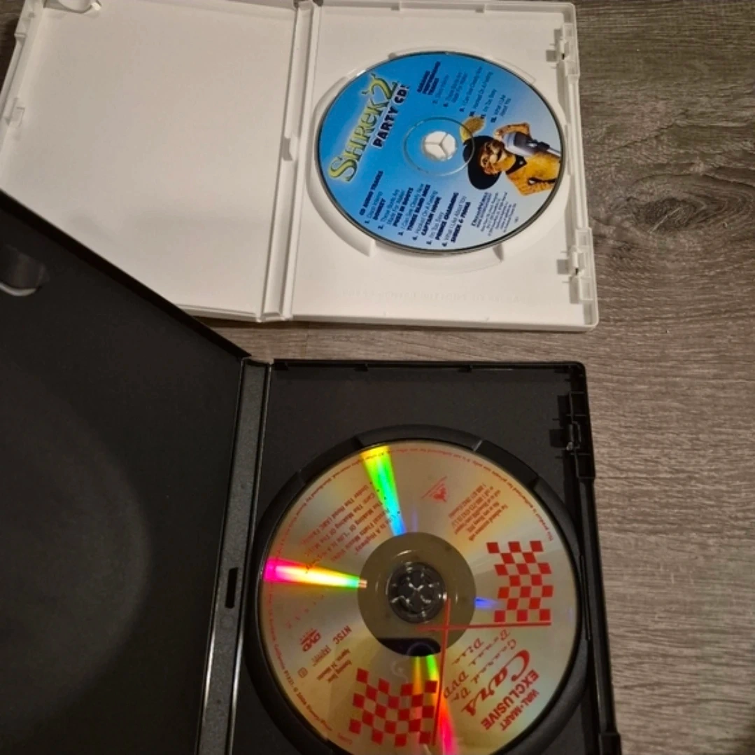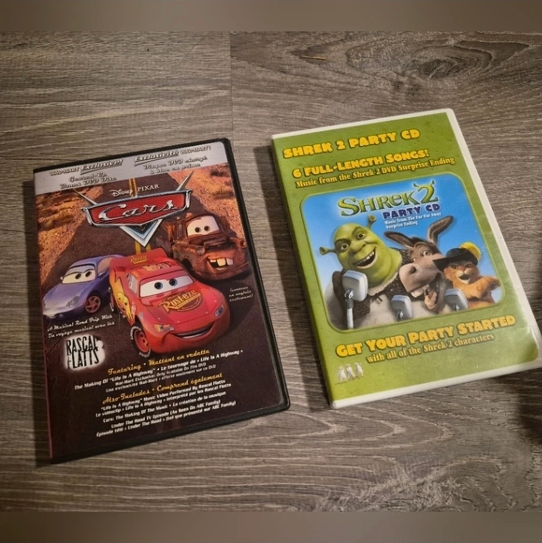 Includes the Disney Pixar Cars DVD featuring Rascal Flatts. Also comes with the Shrek 2 Party CD with full-length songs. Both discs are in their original cases.