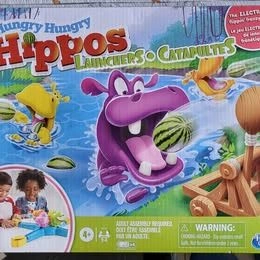 20The Hungry Hungry Hippos Launchers game is a flippin' fast feeding frenzy as players launch plastic watermelons directly into their hippo's mouth. The motorized game unit has the hippos opening and closing their mouths while players continue to fling the melons, hoping to land the most shots. It's fun for kids to press and release the melons from the launcher, and watch each swallowed watermelon roll back down into the scorecard ramp. Like the classic Hungry Hungry Hippos game, this electronic game is fun for boys and girls ages 4 and up. Play it on rainy days, play dates, and Family Game Night. Hasbro Gaming and all related trademarks and logos are trademarks of Hasbro, Inc. Includes base, 4 hippos, 4 ramps, 4 launchers, 20 plastic melons, and game rules. For 2-4 players.