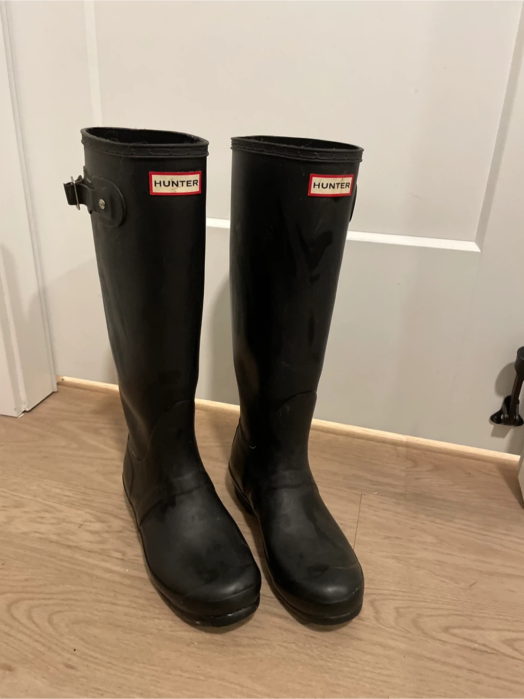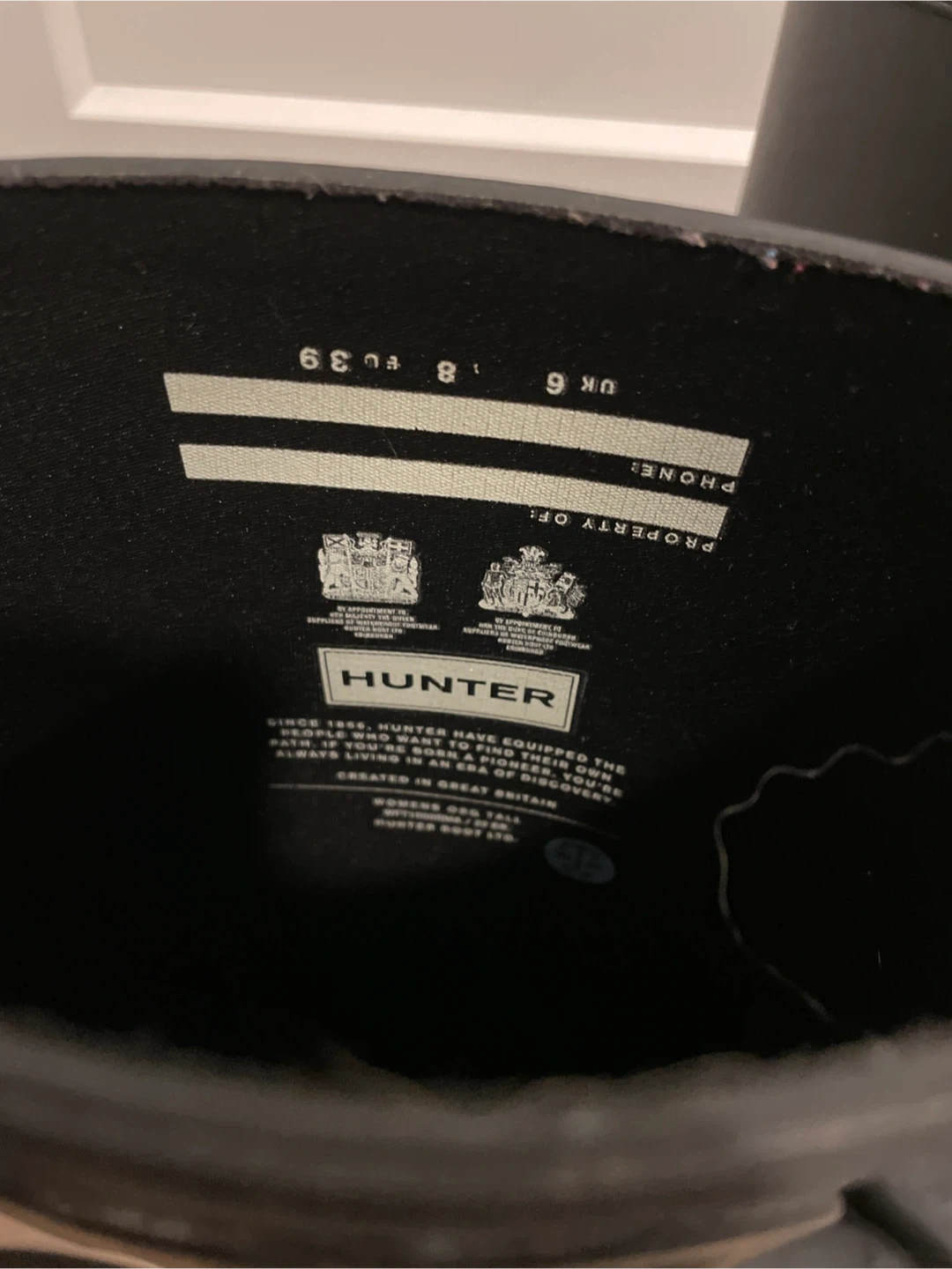 75Selling a pair of Hunter rain boots Original Tall in black. They are a women's size 8 (UK size 6, EU size 39). Perfect for rainy days!