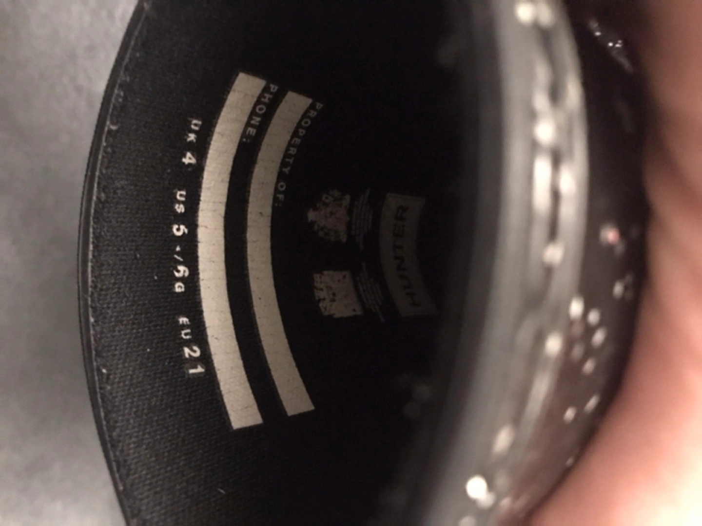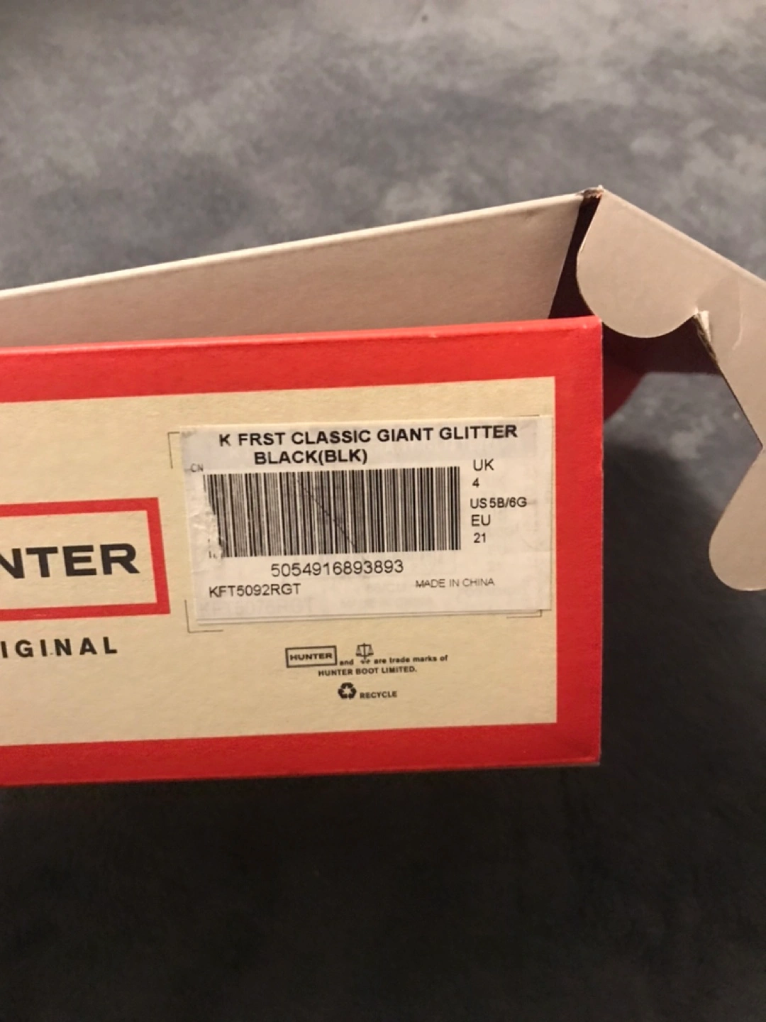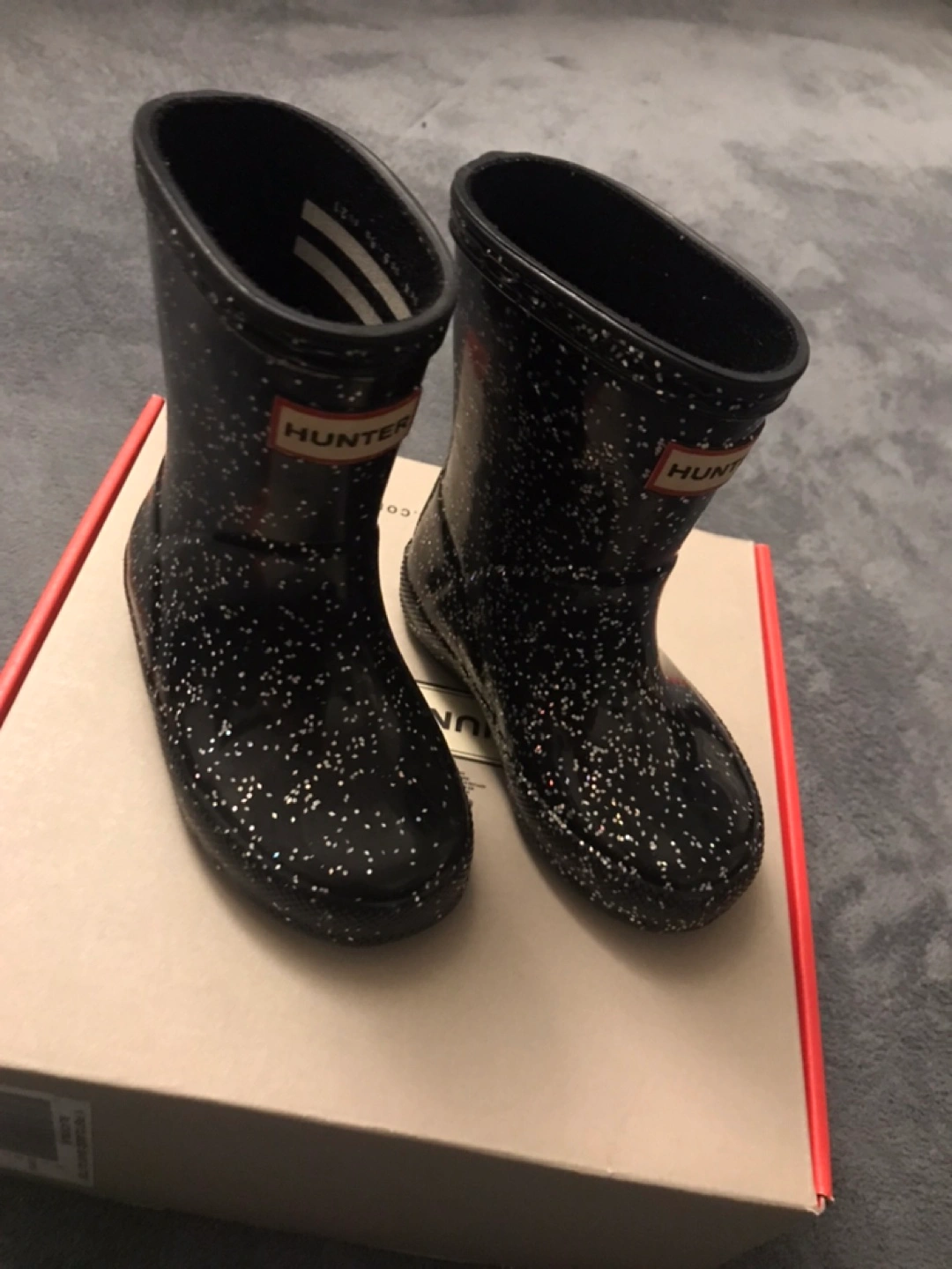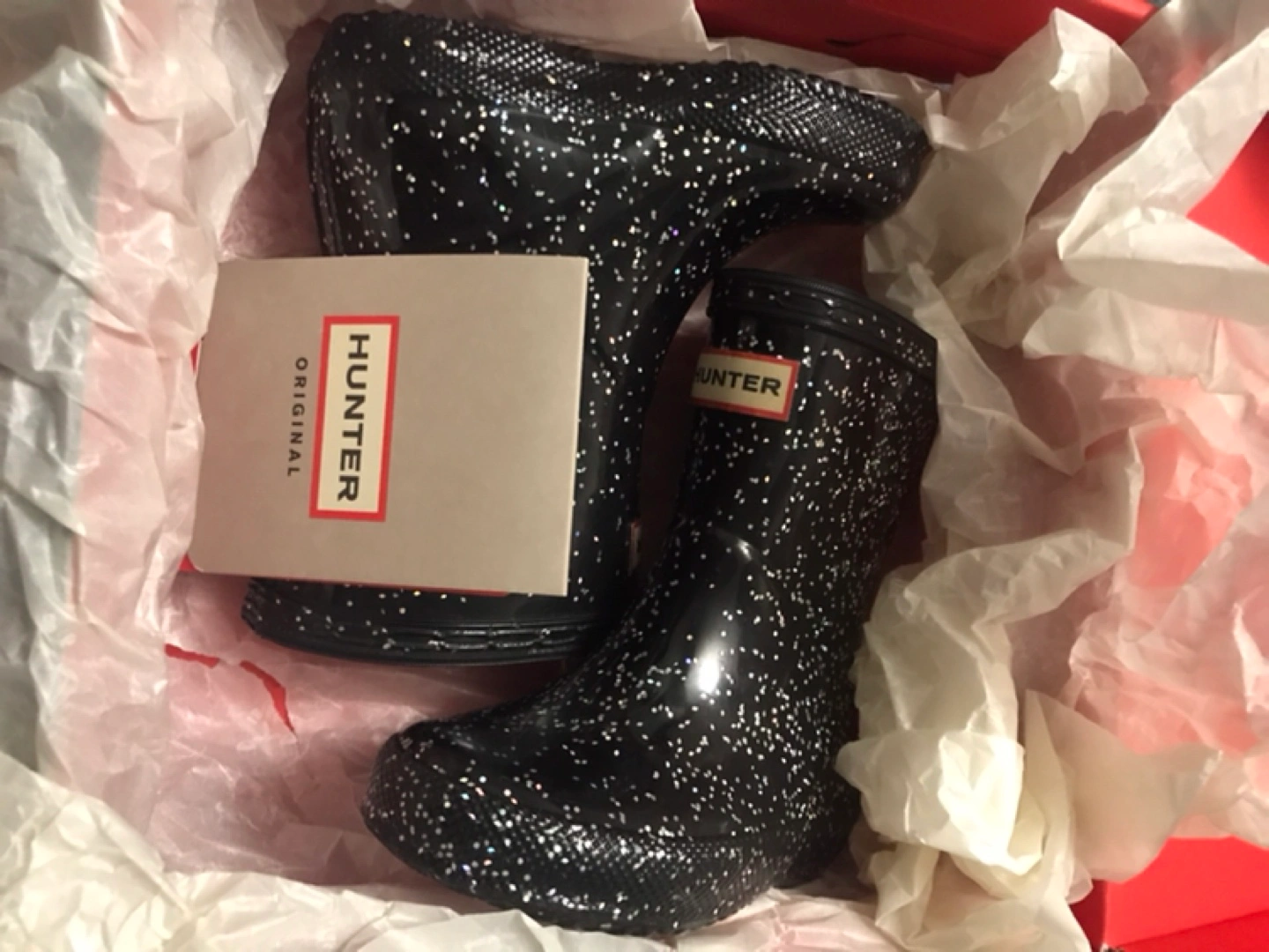 42Selling a pair of Hunter Kids First Classic Giant Glitter rain boots in a size US 5. They are black with glitter and come with the original box