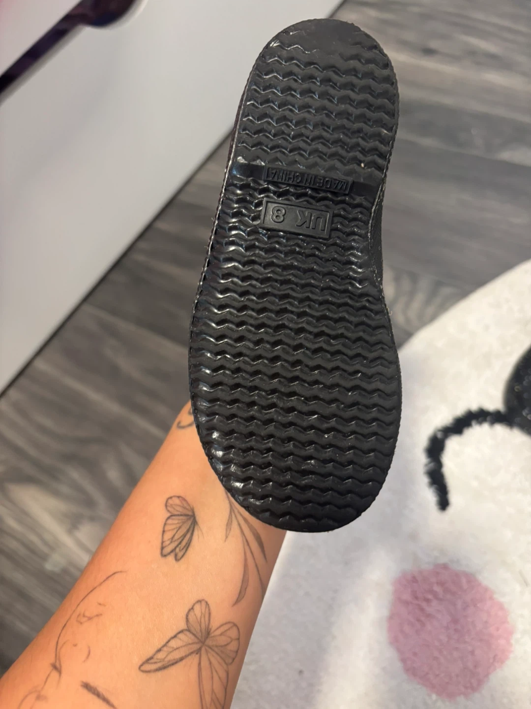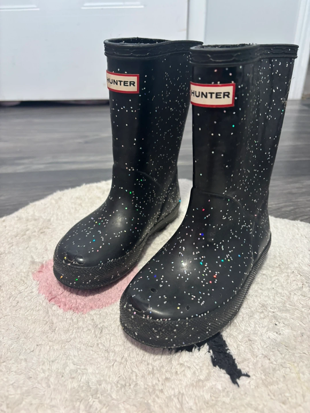 10These adorable Hunter First Glitter rain boots are perfect for your little one! They're a size 8 and feature a fun glitter design on a black background. Great for puddle jumping and keeping those little feet dry!