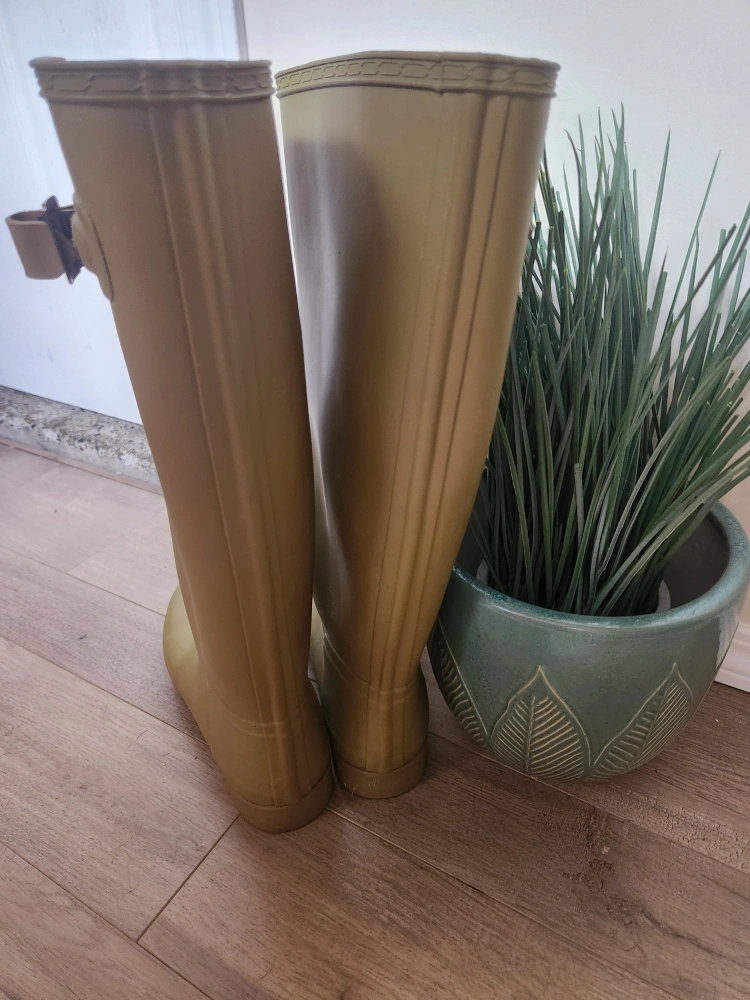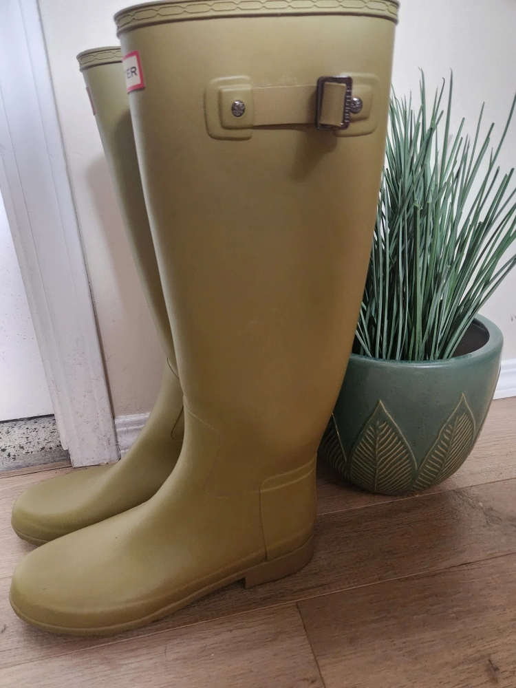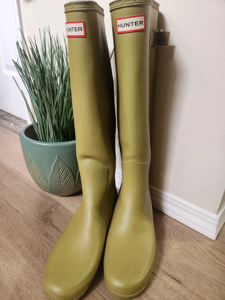 Hunter rain boots in a lovely olive green colour! These are perfect for rainy days or gardening. They're in great condition and ready for a new home. Great for keeping your feet dry and stylish! size 9!!