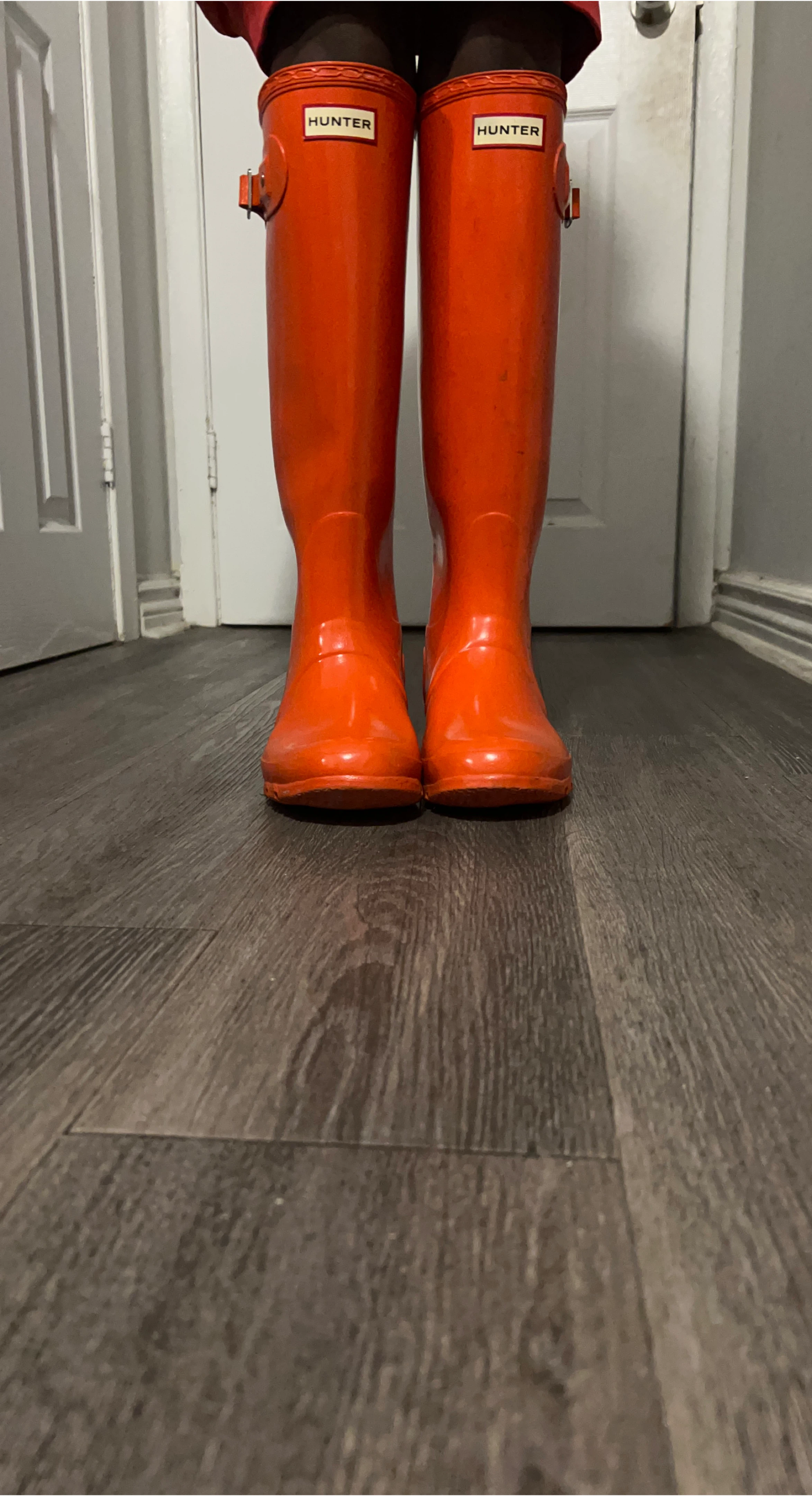 98Selling a pair of Hunter rain boots in a vibrant orange colour. They're in good condition and ready to keep your feet dry on those rainy days!