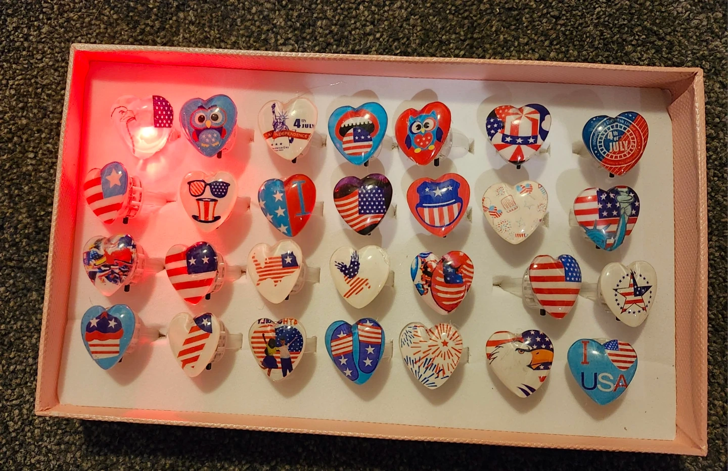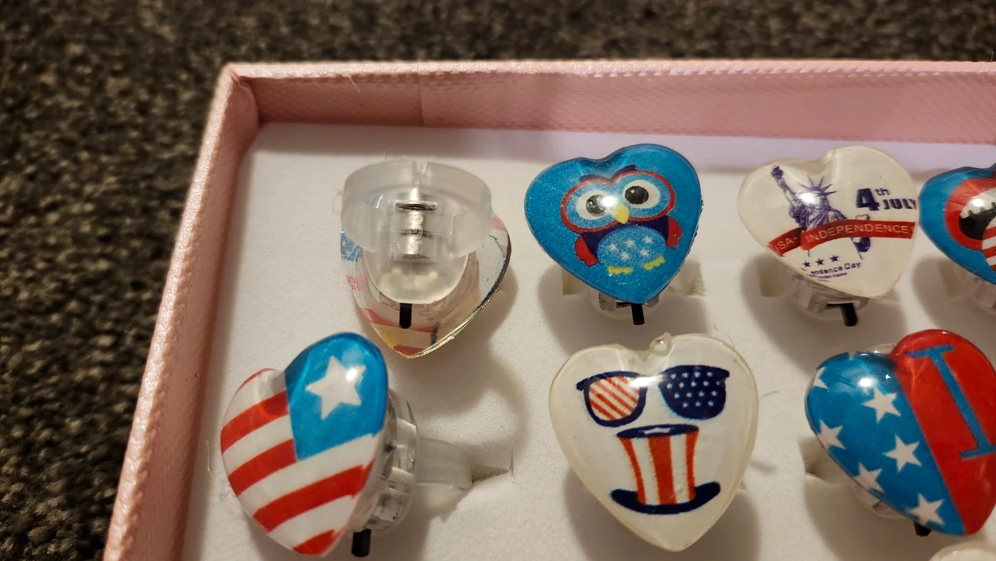 A set of heart-shaped rings with various USA-themed designs, including flags and fireworks. Some rings light up with a red glow when activated. They're great for parties and celebrations!