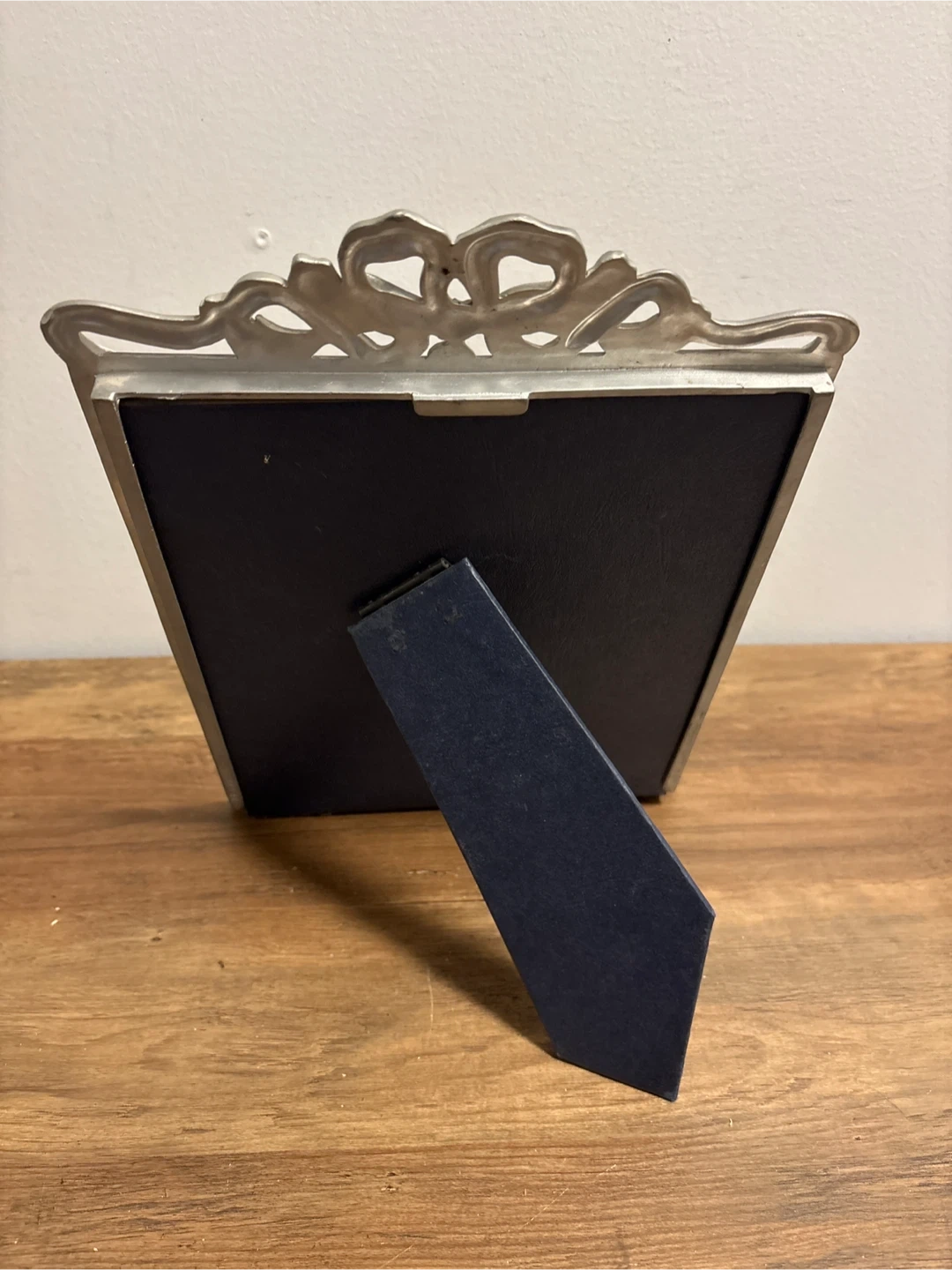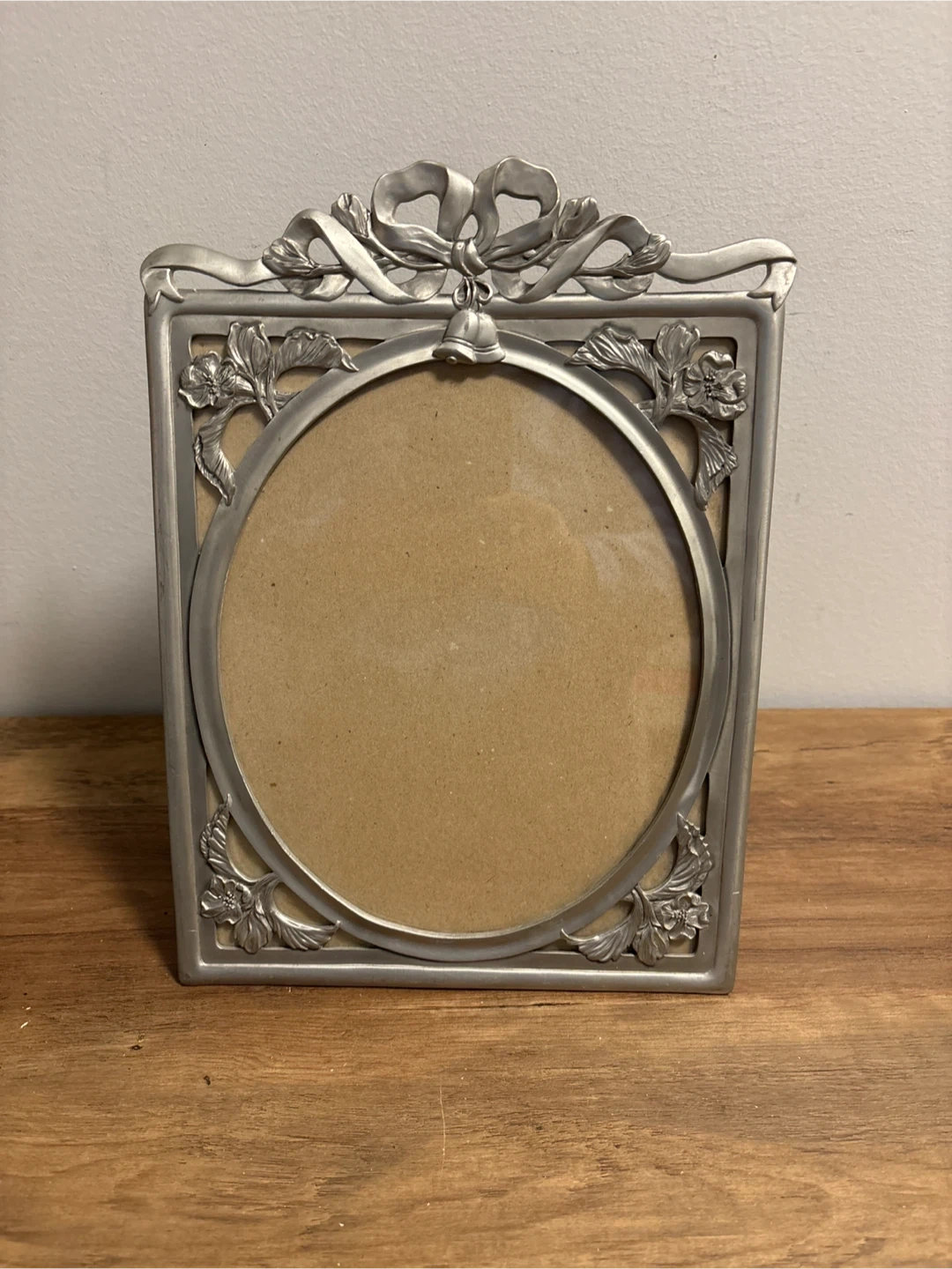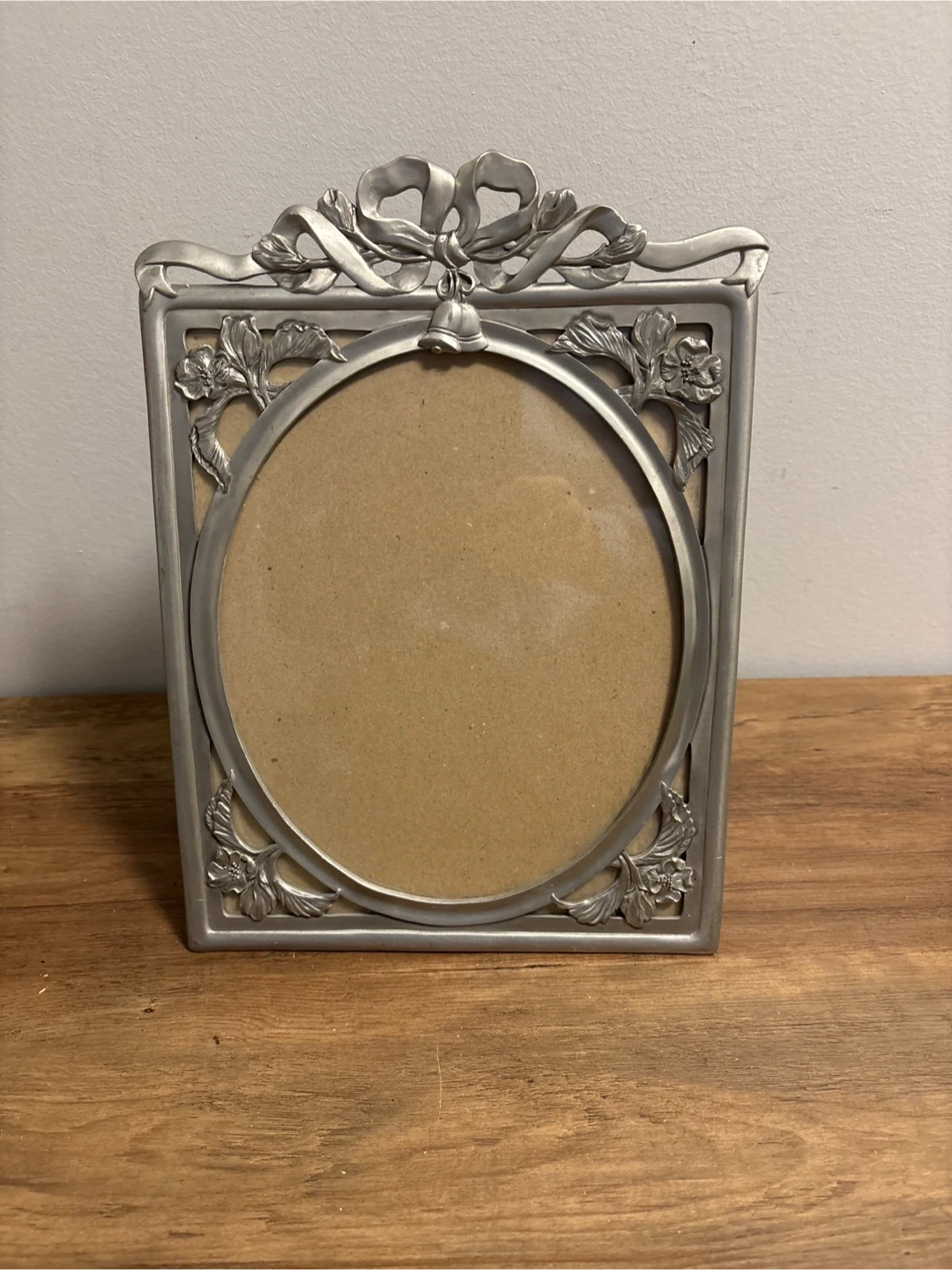 Elegant metal photo frame with a decorative bow and floral detailing. The frame has a tarnished silver-tone finish. It features a circular opening for a photo, and a stand on the back for display.