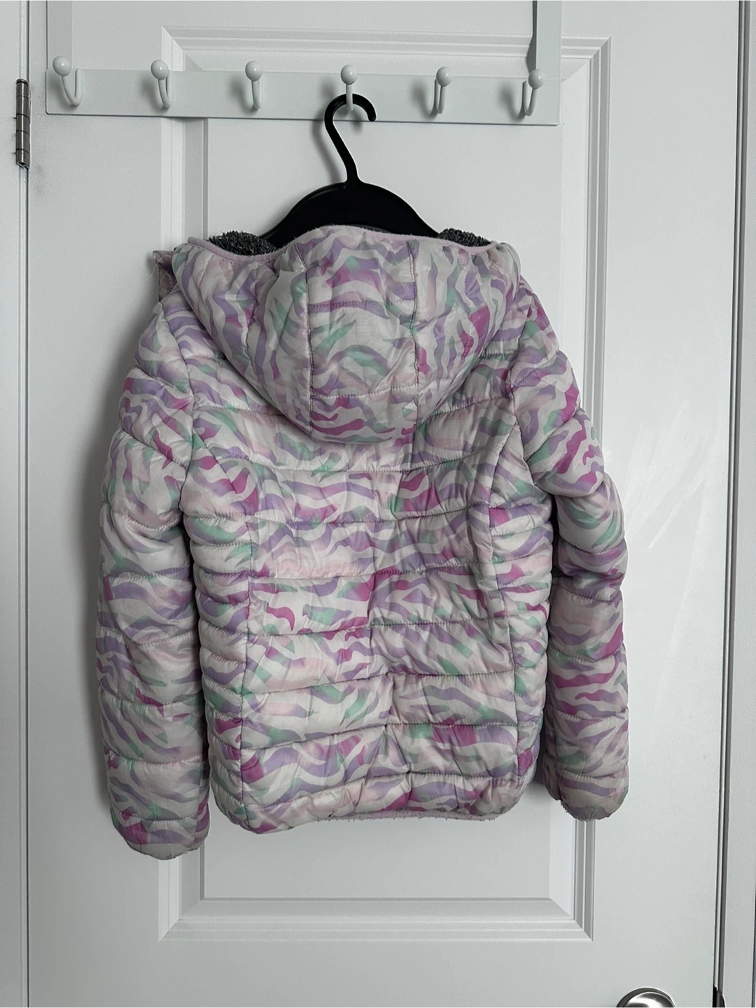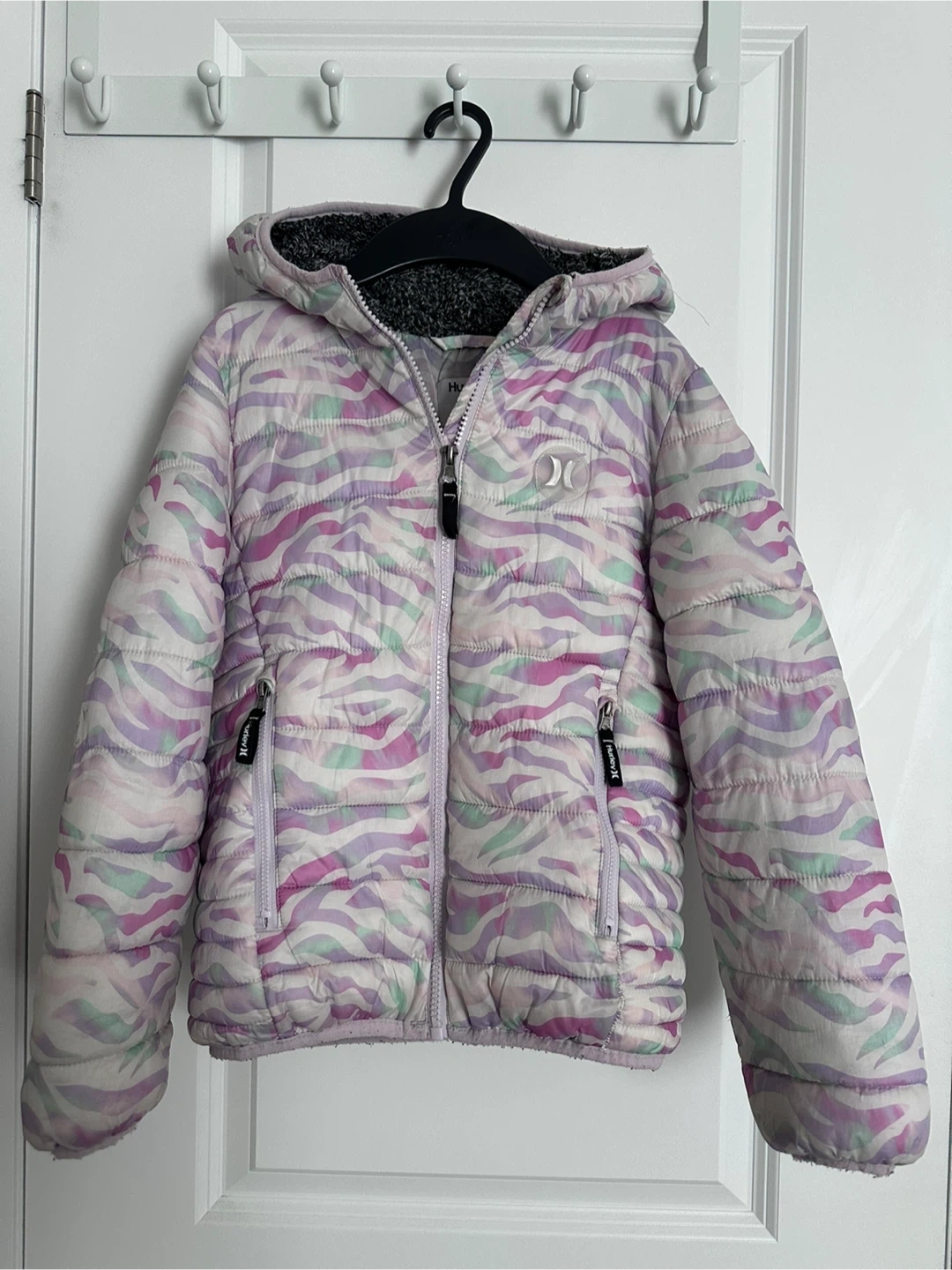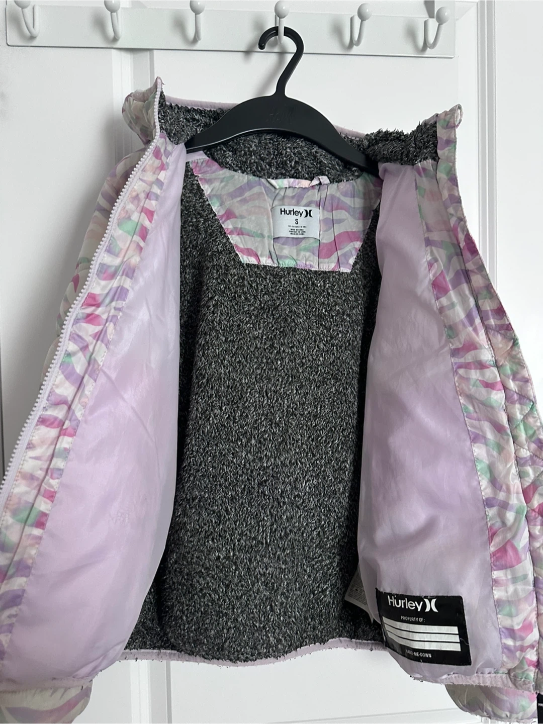 727Selling a cute Hurley girls' puffer jacket in size S (122-128 cm — 8-10 years). It features a fun, colourful pattern and a cozy hood. Perfect for keeping your little one warm and stylish during cooler weather. The jacket is in great condition and ready for a new home!
