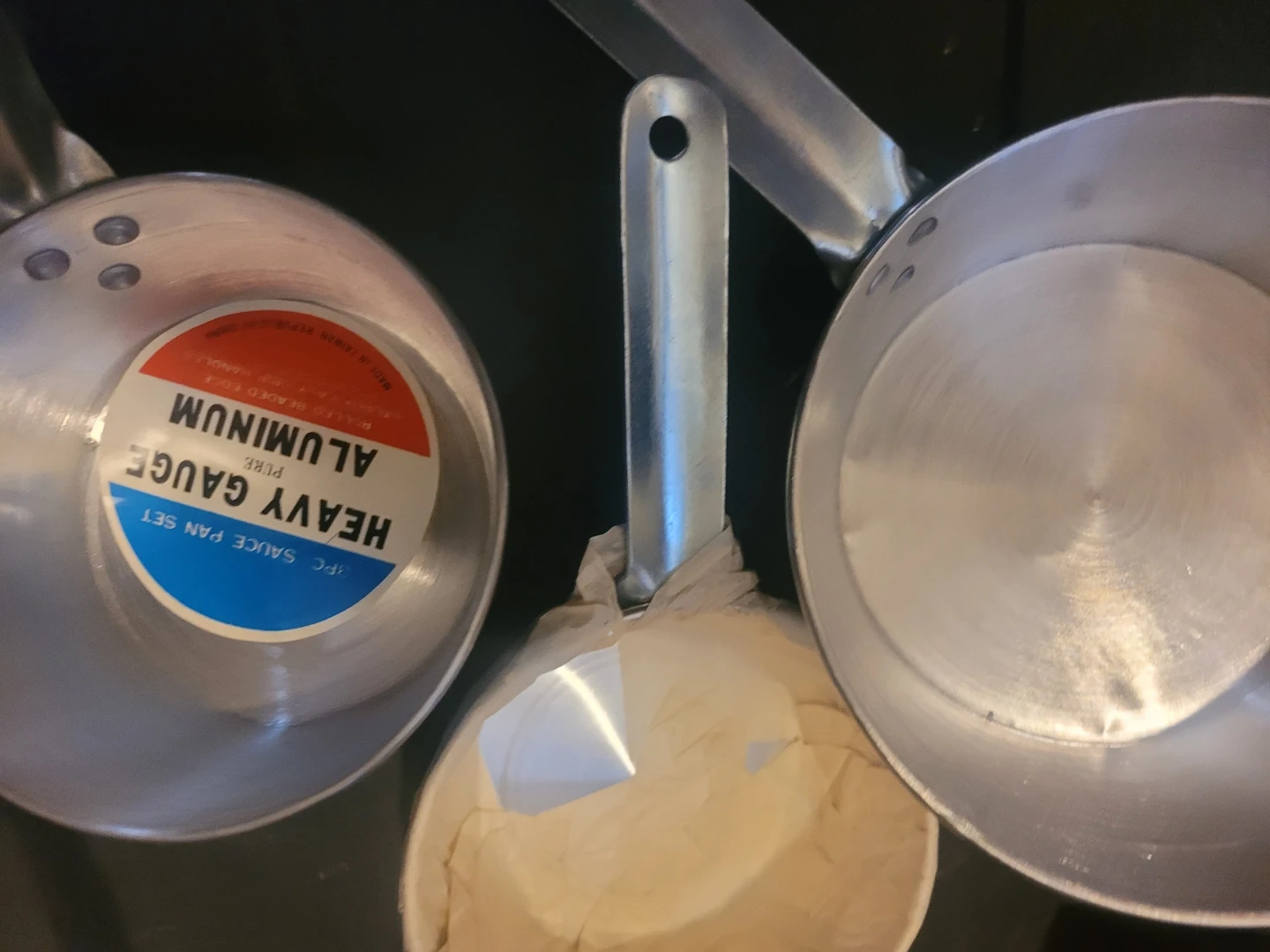 This is a 3-piece sauce pan set made of heavy gauge aluminum. It includes original packaging. Aluminum material.
