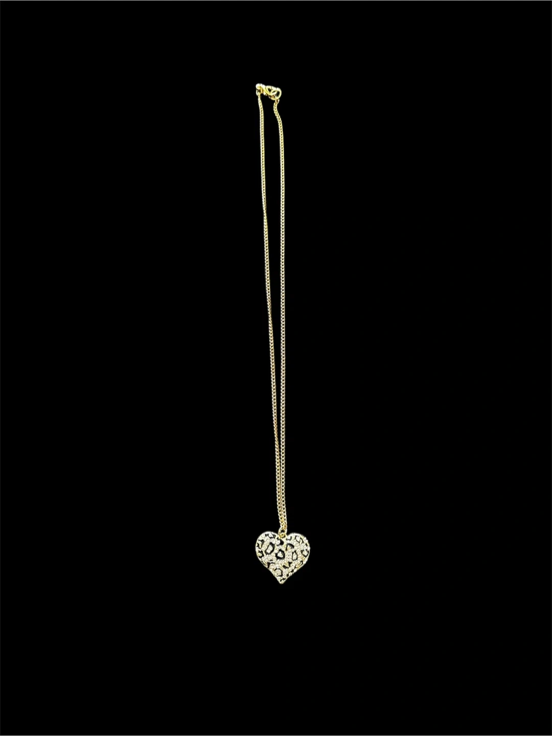 18 1/2 in Stainless steel gold-tone heart pendant necklace. The heart is decorated with a black and leopard print pattern and sparkly stones. It's a beautiful and eye-catching piece of jewelry! Comes with box.
