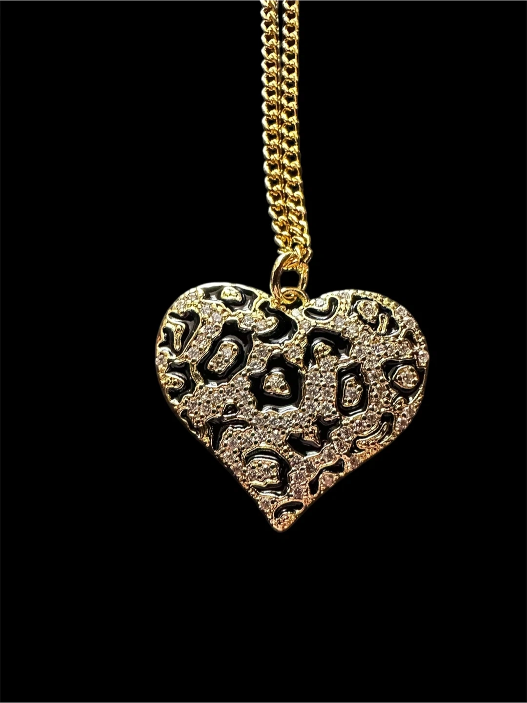 18 1/2 in Stainless steel gold-tone heart pendant necklace. The heart is decorated with a black and leopard print pattern and sparkly stones. It's a beautiful and eye-catching piece of jewelry! Comes with box.