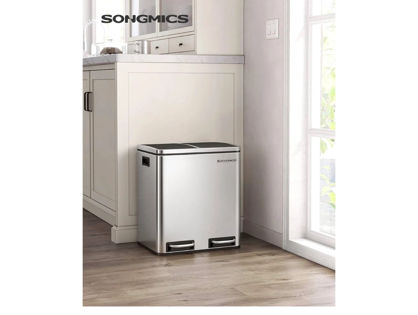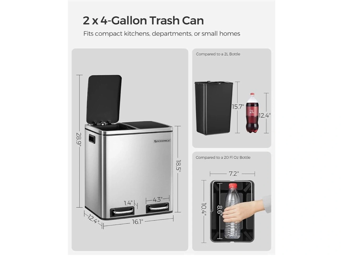 This SONGMICS dual compartment trash can is made of stainless steel. It features two 4-gallon inner buckets, each with its own lid. Each compartment has a pedal for easy opening. It's 16.1" wide, 12.4" deep, and 28.9" tall with the lid open.
