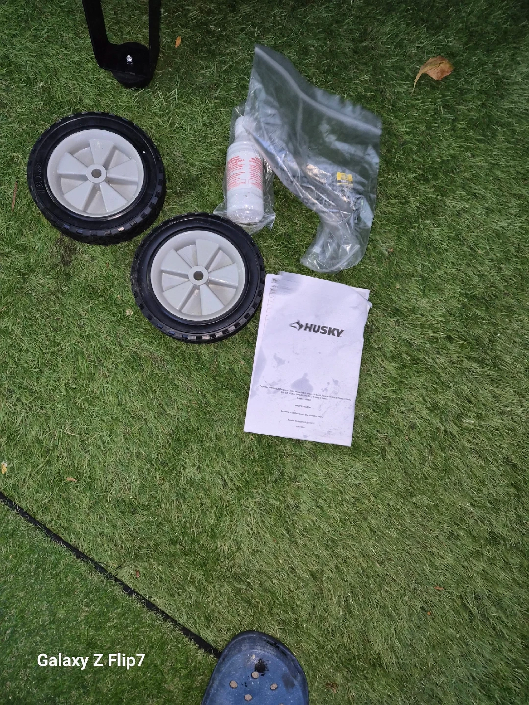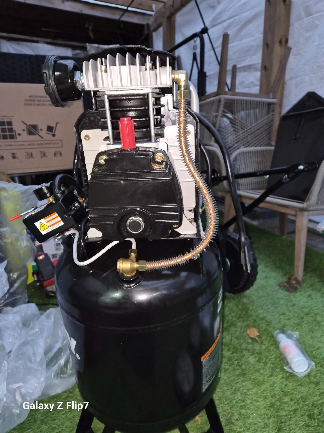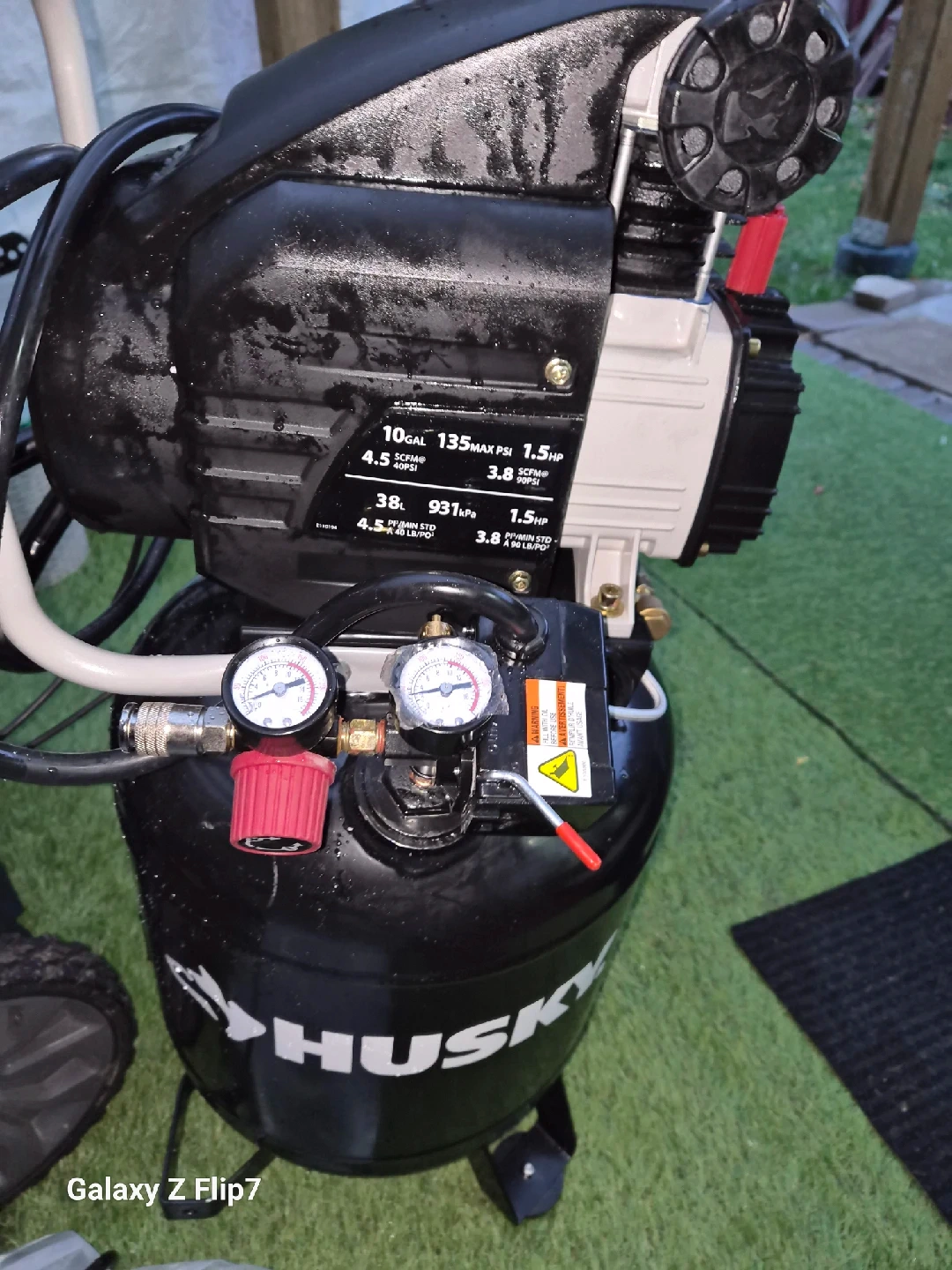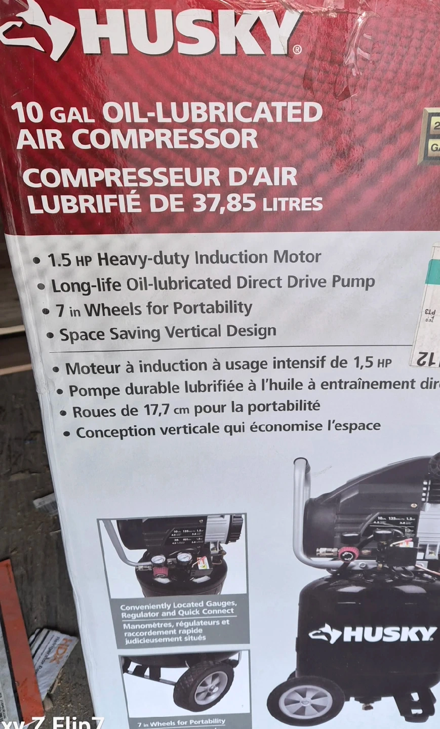 78Selling a Husky 10-gallon oil-lubricated air compressor! It features a 1.5 HP heavy-duty induction motor and a long-life oil-lubricated direct drive pump. It also has 7-inch wheels for portability and a space-saving vertical design. Comes with the wheels and instructions