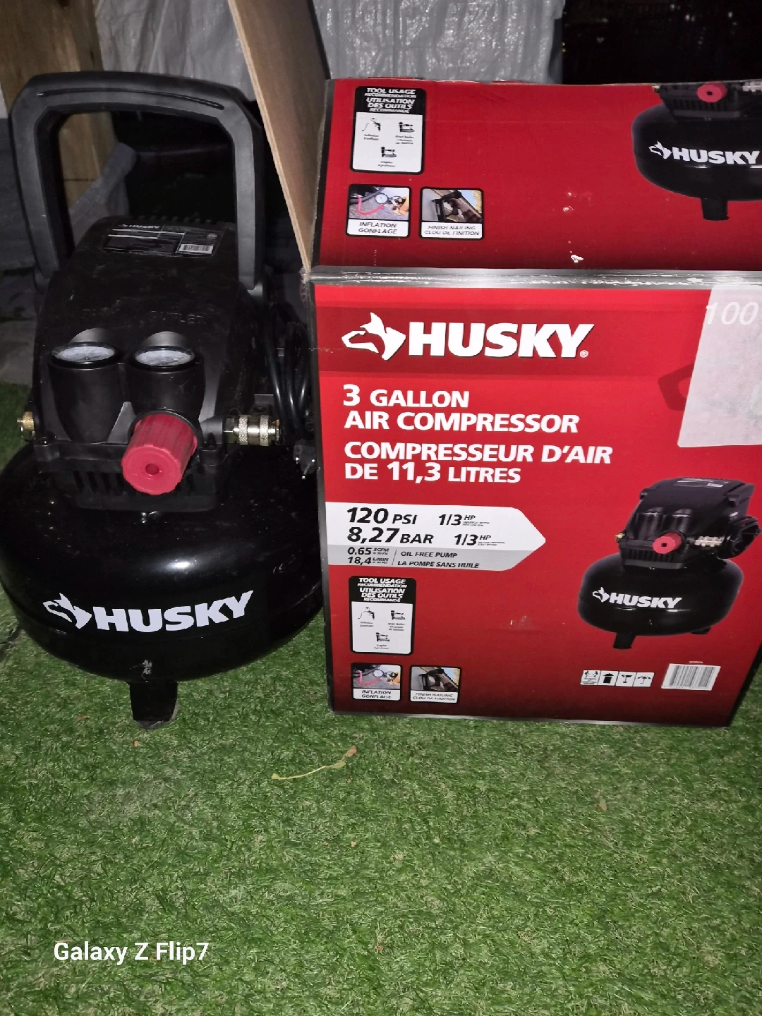 91Selling a Husky 3-gallon air compressor. It has a 120 PSI and a 1/3 HP motor. It is an oil-free pump.