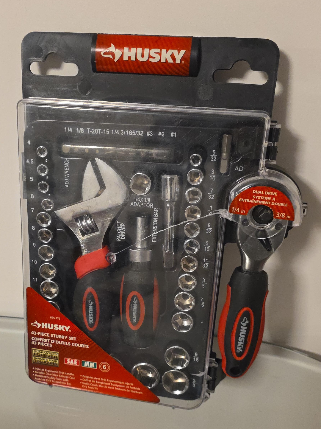 Selling a brand new Husky 43-piece stubby set! It's still in the original packaging and ready for your next project. This set includes improved ergonomic grip handles and a durable clear view storage case. Perfect for tight spaces!