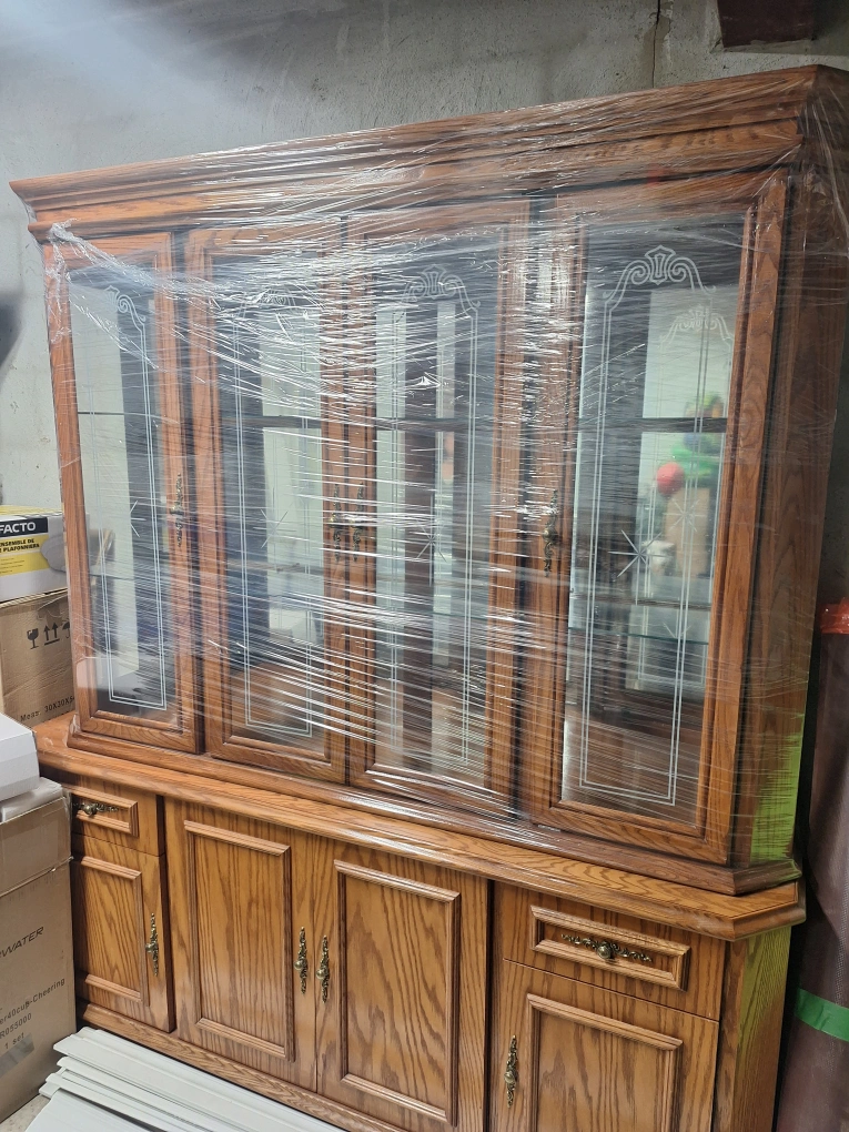 30Very solid hutch/ buffet display cabinet Has a few minor scratches which are hardly noticeable. You'll need a couple people and a truck to carry it- it's not light. Originally purchased for about a 1000 dollars. It's about 5 feet and 9 inches wide from side to side. About 1 foot 8 inches deep front to back. About 6 feet 5 inches tall. All approximate. Hard to measure exact. Kept in a pet free smoke free home.