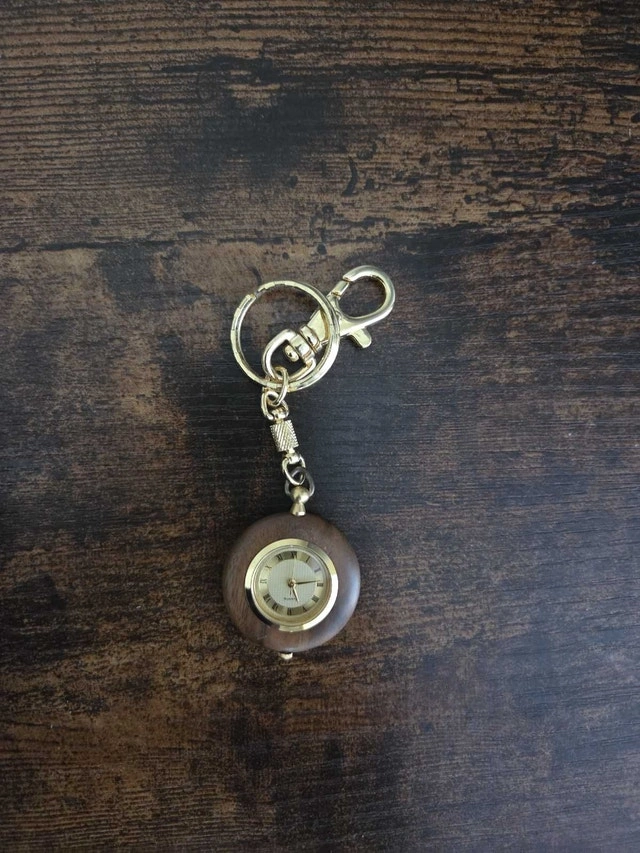 Add a touch of whimsy to your everyday carry with this unique watch keychain. This item is used, and features a charming miniature analogue watch with a wood-look surround and a classic gold-tone finish. It's the perfect functional accessory to clip onto your keys, bag, or jacket. The watch face is easy to read and adds a quirky, retro vibe to any item. Looking for a unique piece? This could be it!