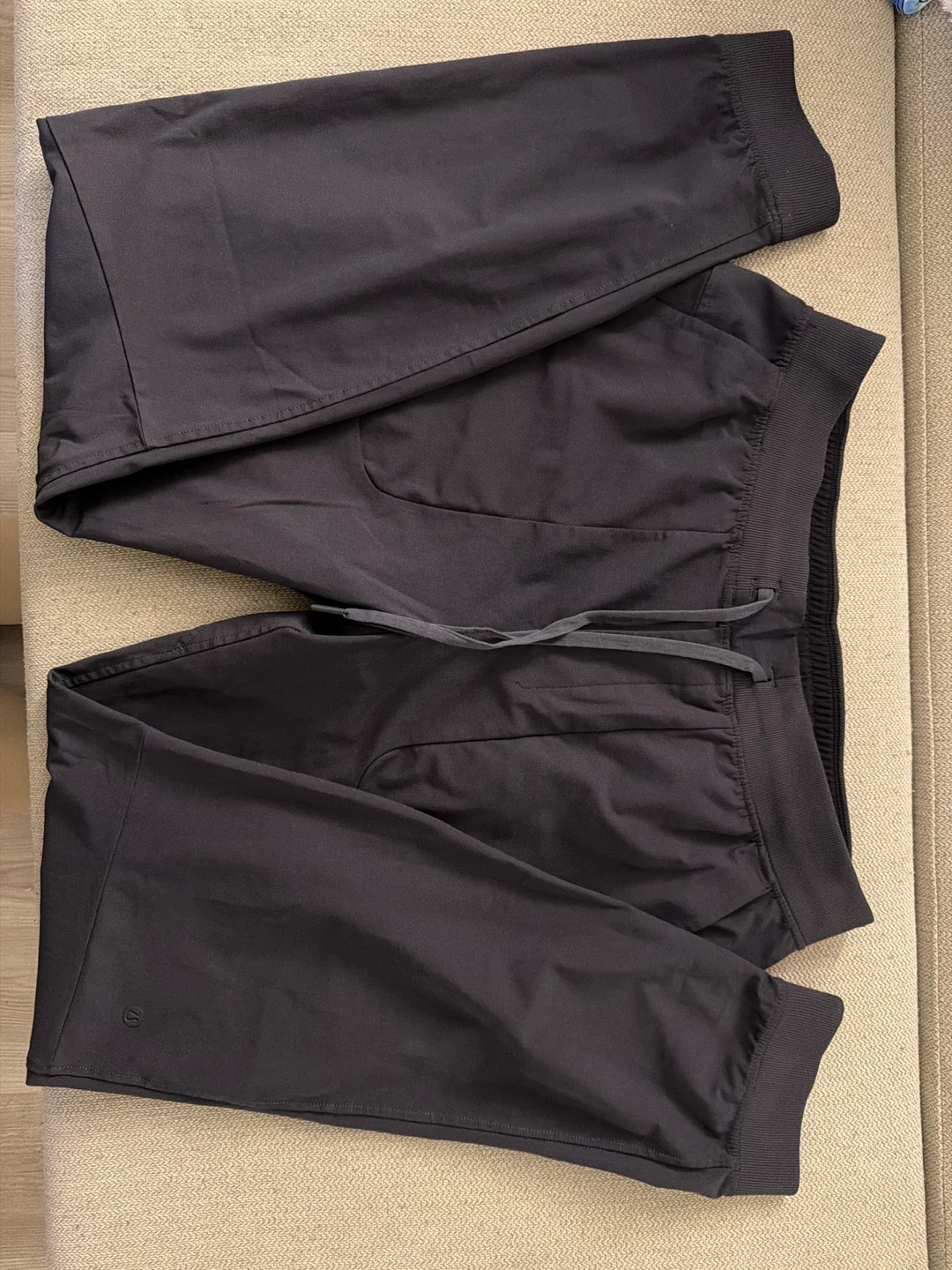 These are Lululemon jogger pants in dark grey. They feature a drawstring waist and cuffed ankles. These were purchased around 2021, good condition.