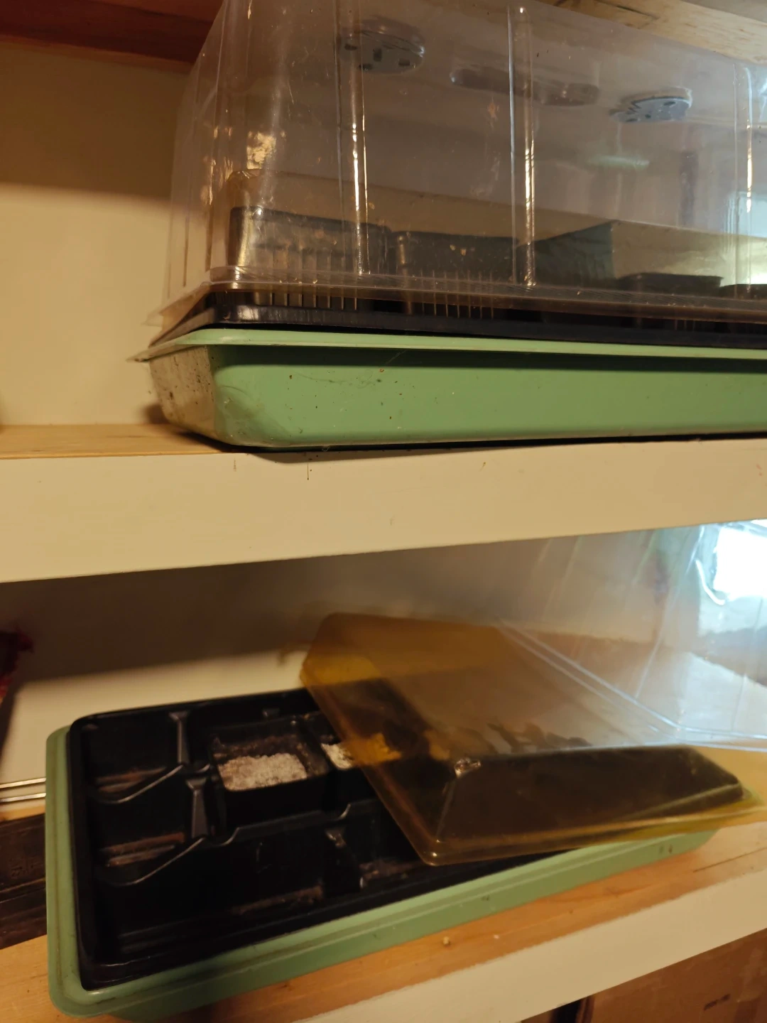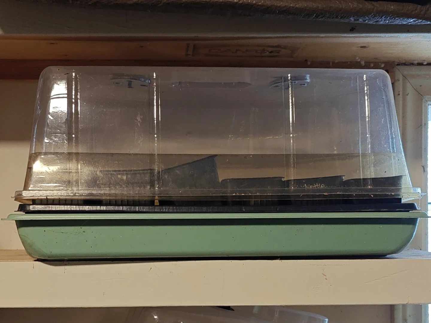 Two 18 pot trays. Green Catch Tray, Black Organizer Tray, Pots, tinted low Germination covers, and tall Clear Adjustable Ventilation Greenhouse Covers. This seedling greenhouse tray set is perfect for starting your seeds indoors. The lid has adjustable vents to control humidity and temperature. It's great for creating an optimal environment for germination!