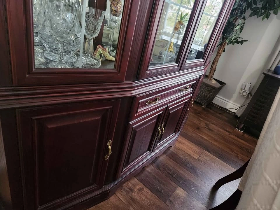 Well cared for dining room set. Table has 3 leaves to expand to sit more. Comes with 6 chairs, two have arms. Cabinet lights up to display during the evening. Solid and heavy pieces.