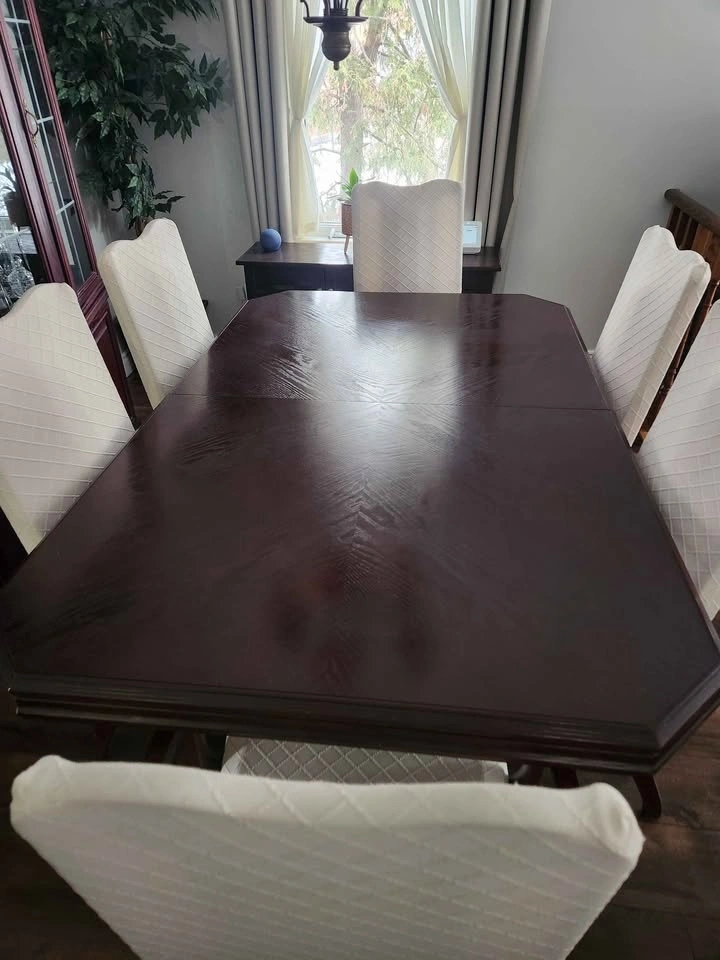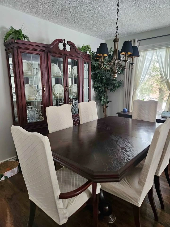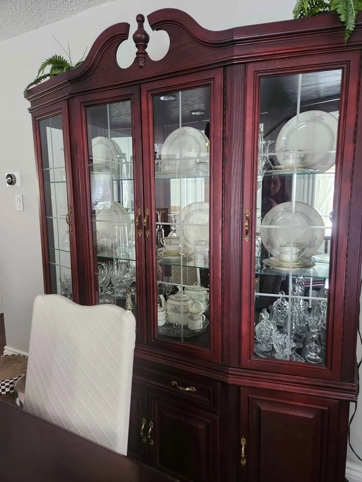 Well cared for dining room set. Table has 3 leaves to expand to sit more. Comes with 6 chairs, two have arms. Cabinet lights up to display during the evening. Solid and heavy pieces.