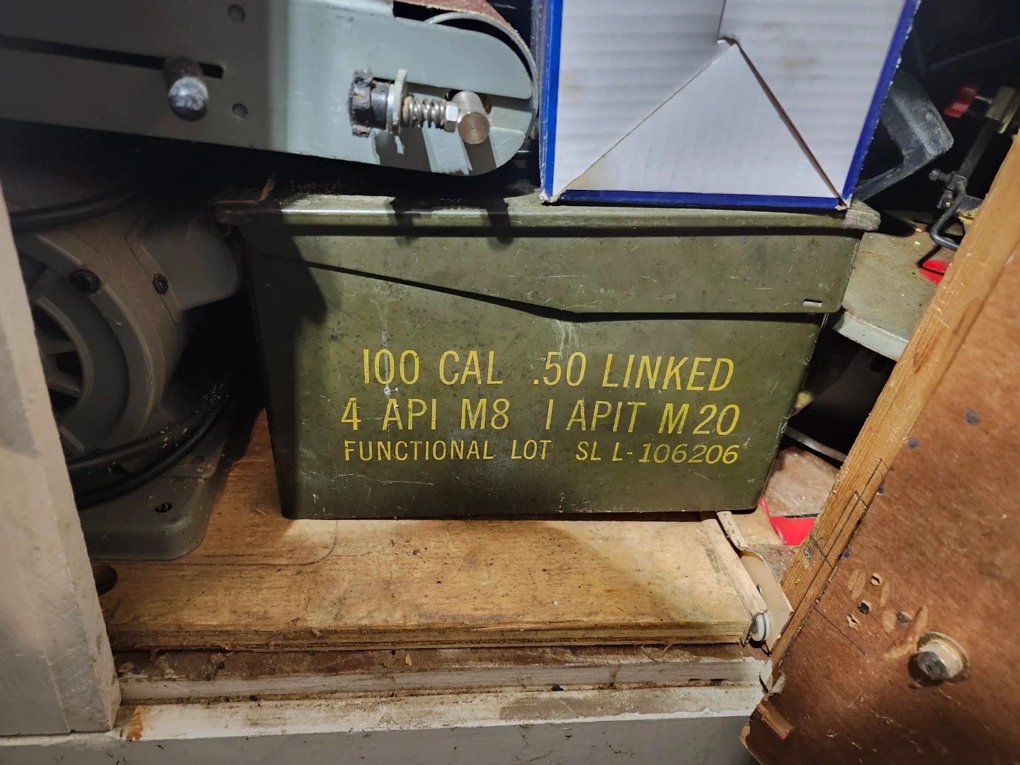 Green metal ammo can for 100 rounds of .50 linked ammunition. It's labeled with '4 API M8 1 APIT M20' and 'FUNCTIONAL LOT SL L-106206'. This can is useful for storing ammunition or other small items.