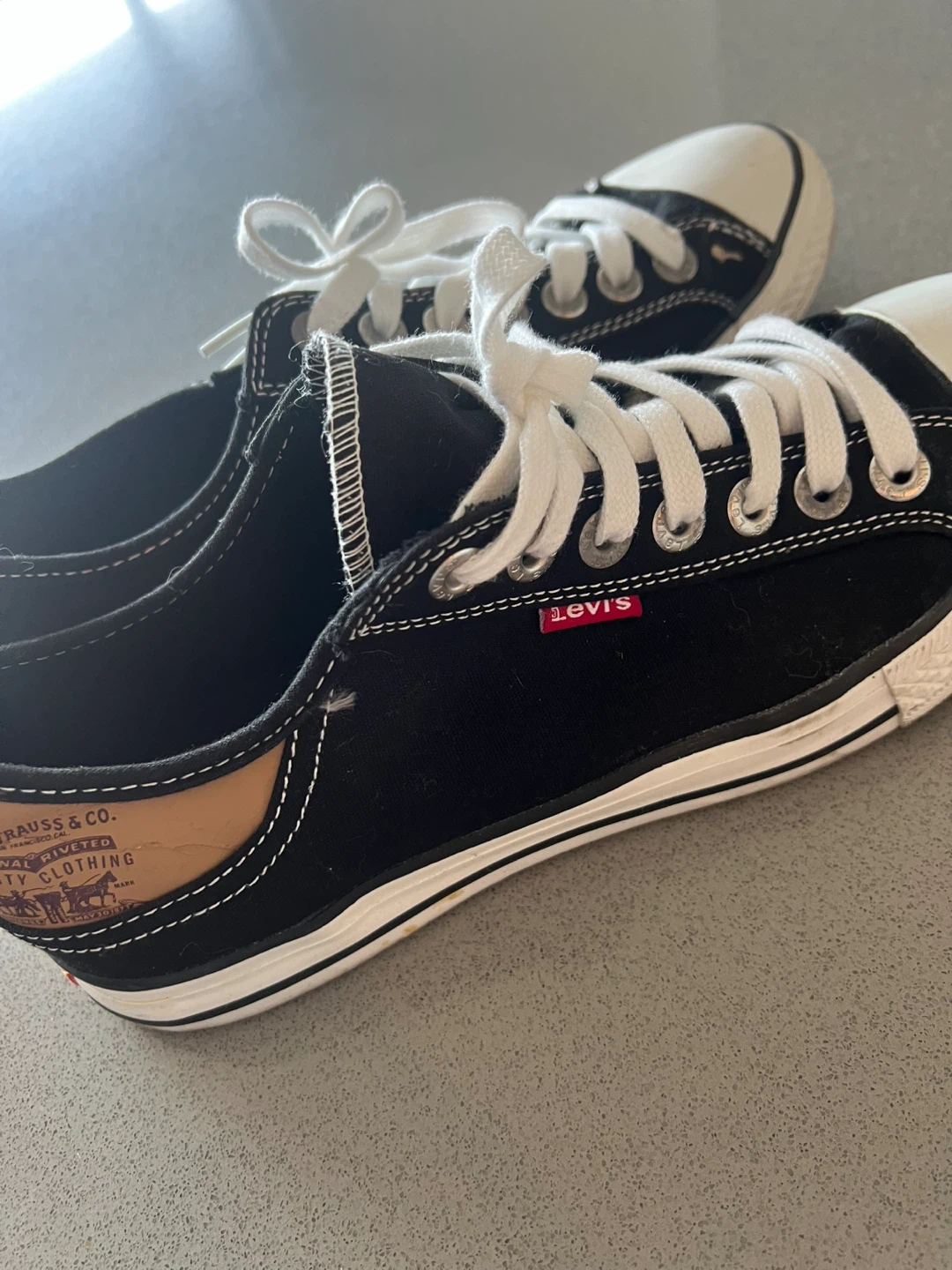 Selling a pair of Levi's black canvas sneakers in US size 9. They have a classic look with white laces and a comfortable sole. Perfect for everyday wear!