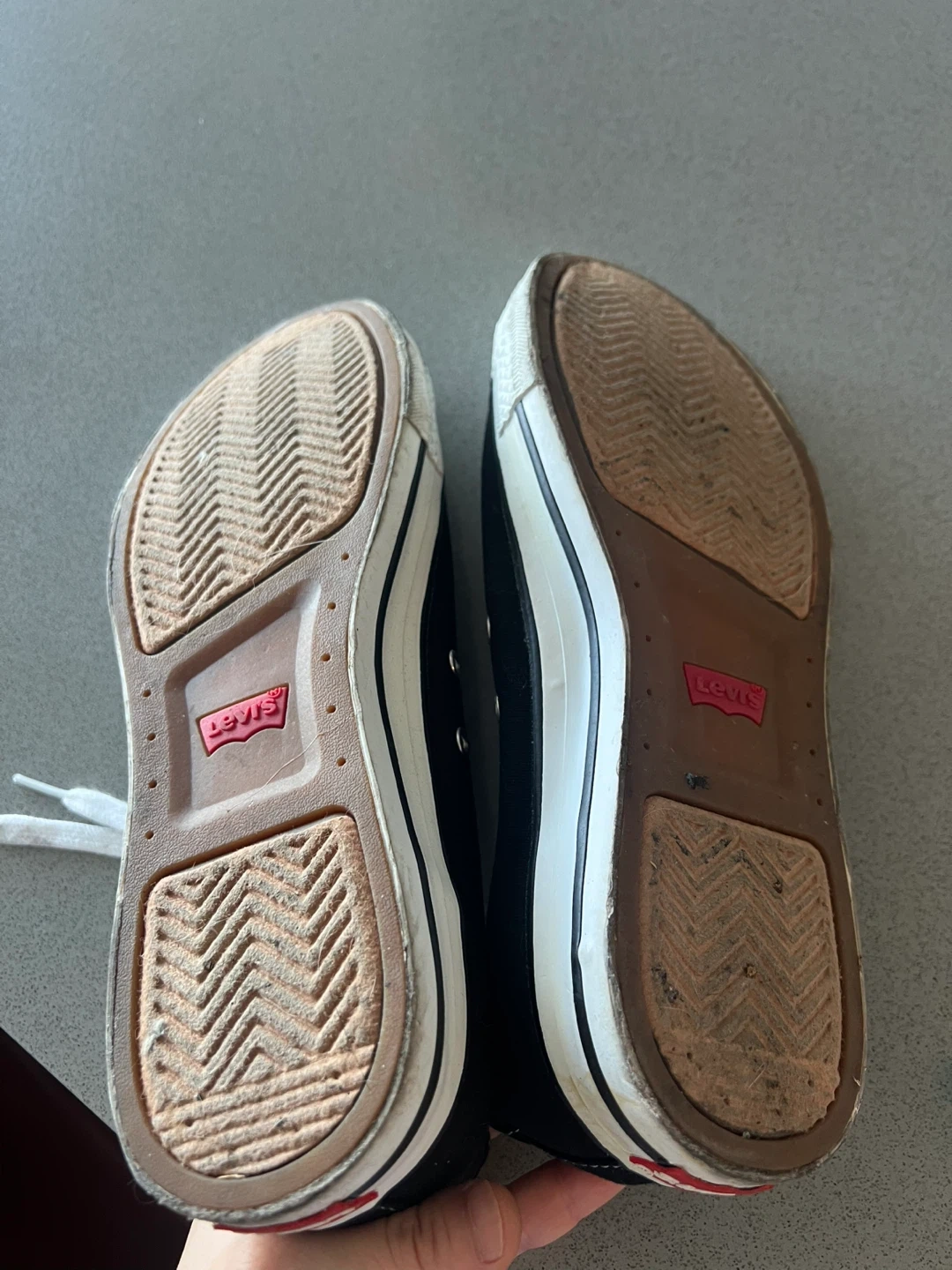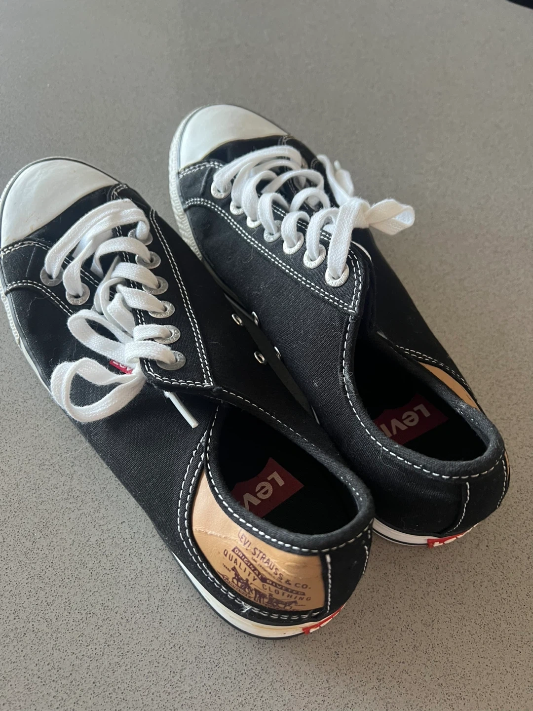 Selling a pair of Levi's black canvas sneakers in US size 9. They have a classic look with white laces and a comfortable sole. Perfect for everyday wear!