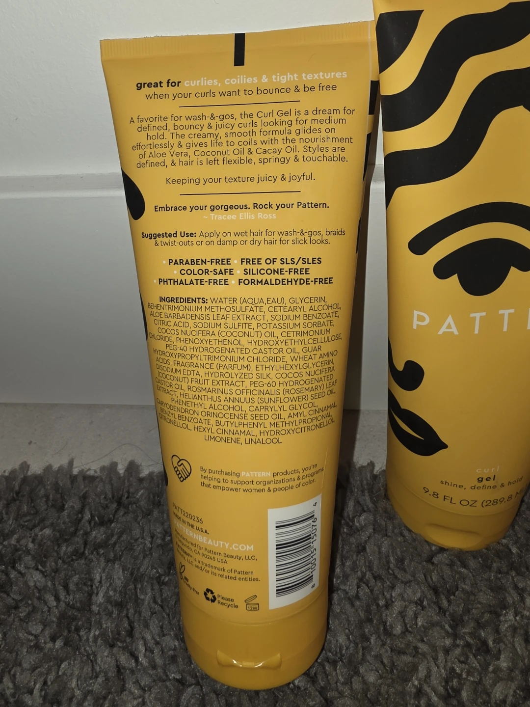 Two tubes of Pattern Curl Gel for shine, definition, and hold. It's great for wash-and-gos and defining curls, coils, and tight textures. Each tube contains 9.8 FL OZ (289.8 ML).