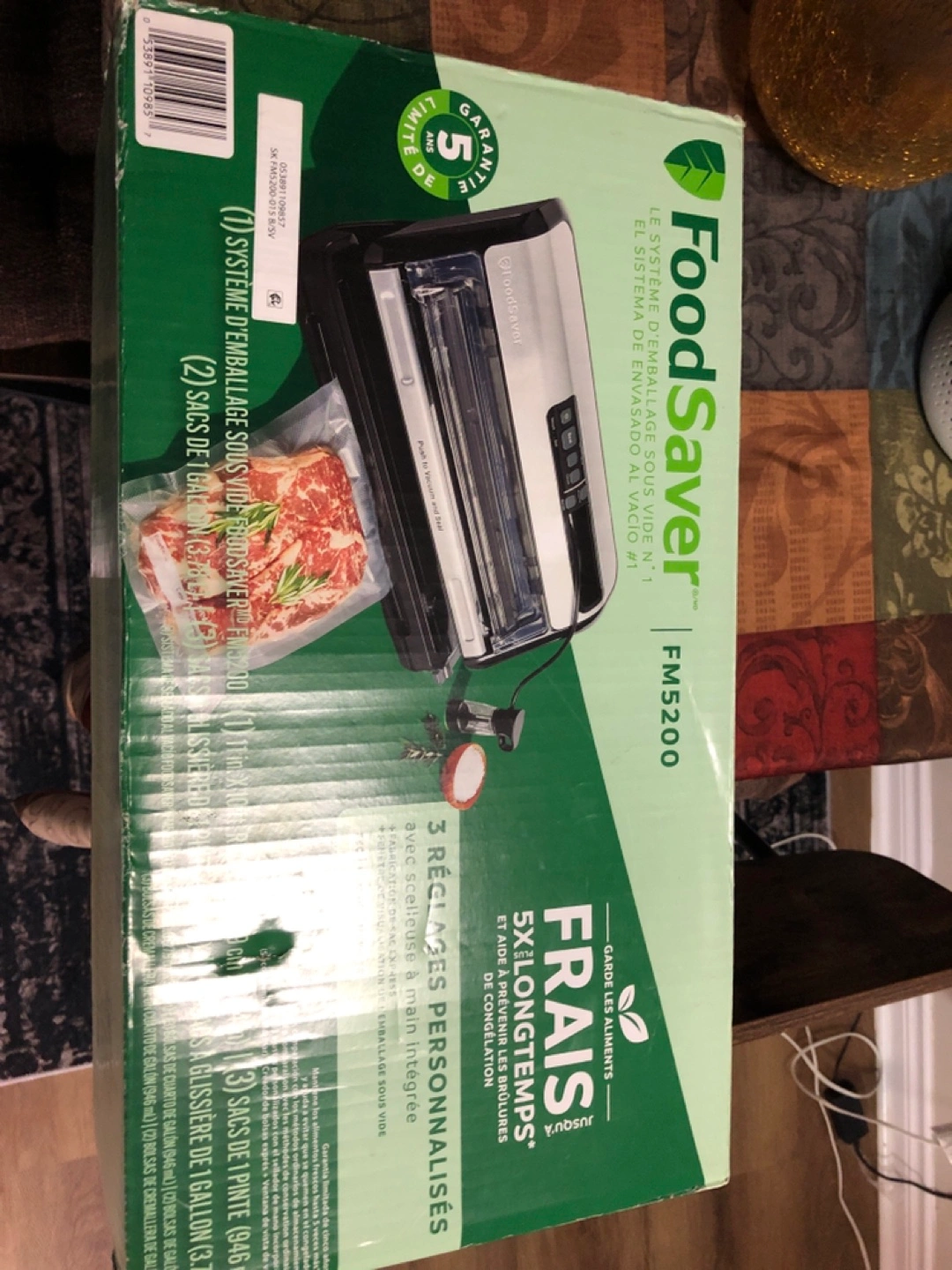 New in box FoodSaver FM5200 vacuum sealing system. Features three custom settings and a retractable hand-held sealer. Keeps food fresh 5x longer. Includes bags.
