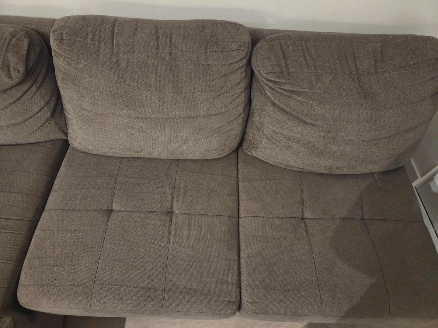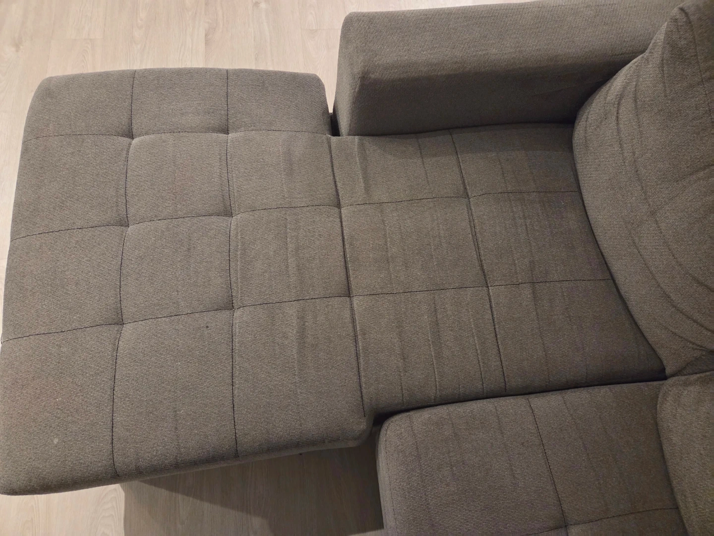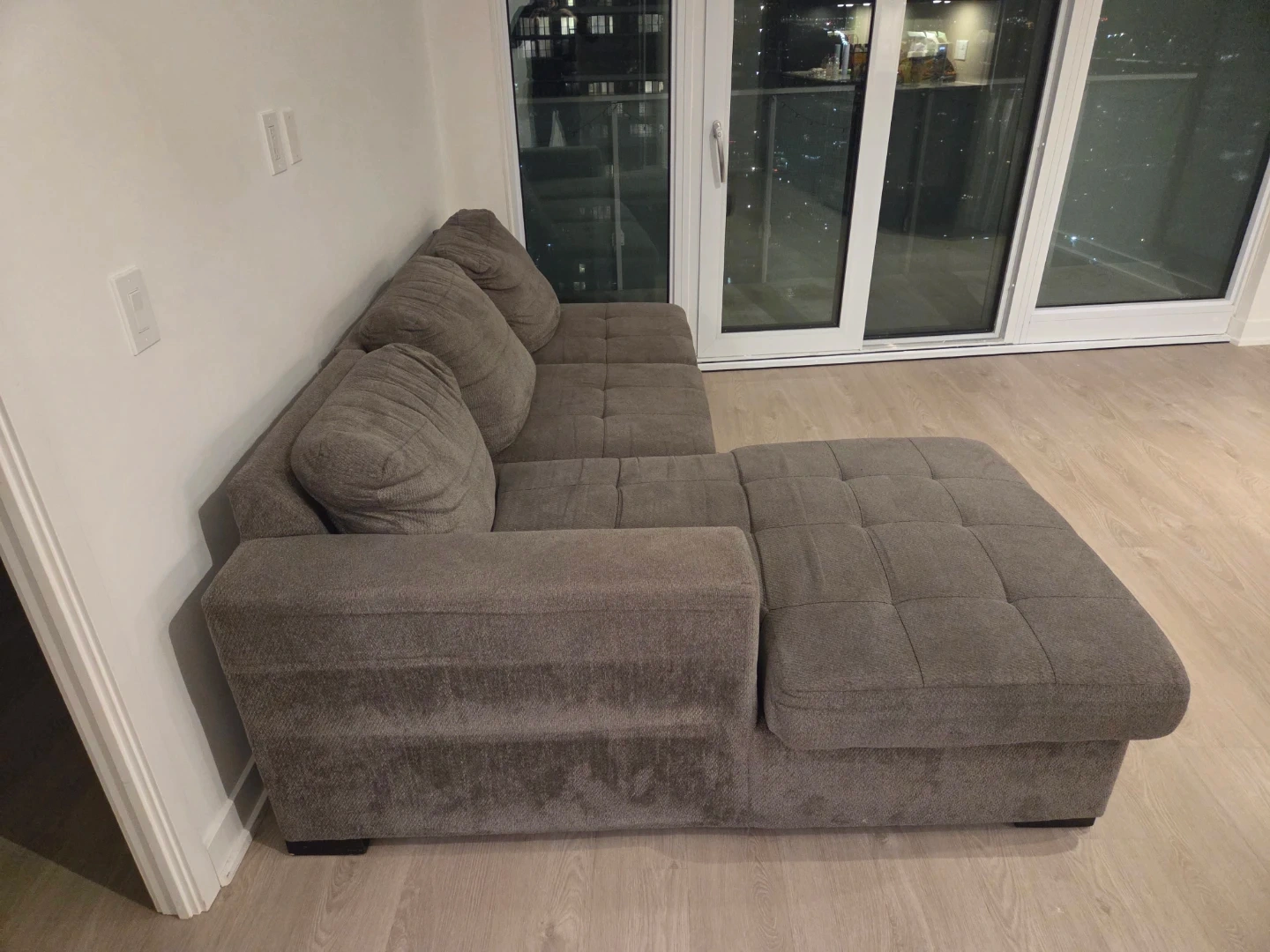 This is a grey sectional sofa with a chaise. It's upholstered in a textured fabric. The cushions are deep and plush, offering comfortable seating. Its tufted design adds a modern touch to any living space.