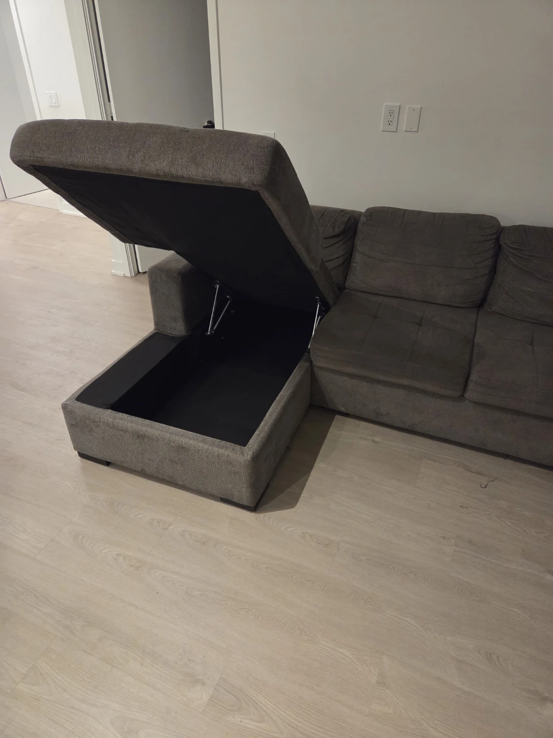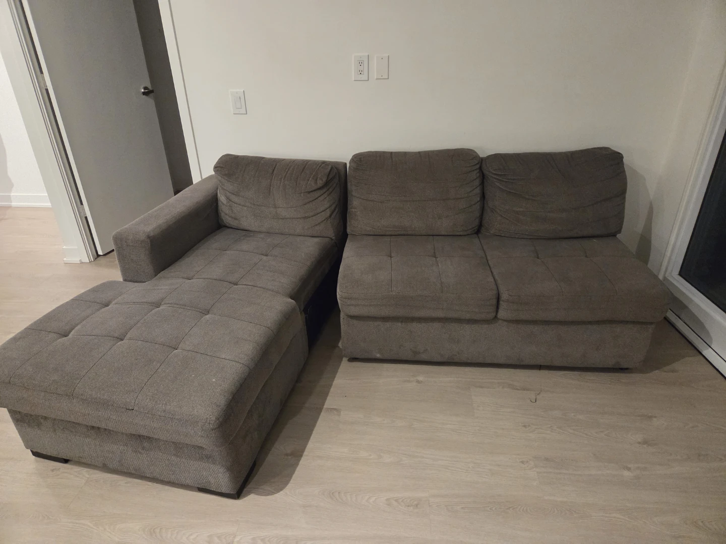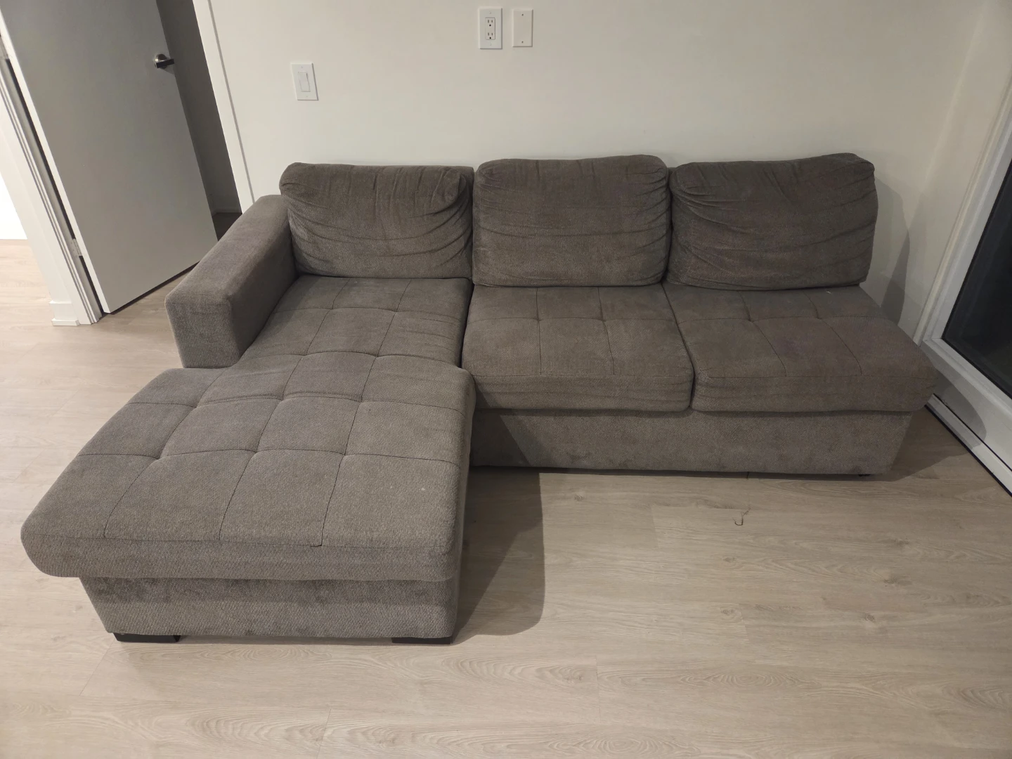 This is a grey sectional sofa with a chaise. It's upholstered in a textured fabric. The cushions are deep and plush, offering comfortable seating. Its tufted design adds a modern touch to any living space.