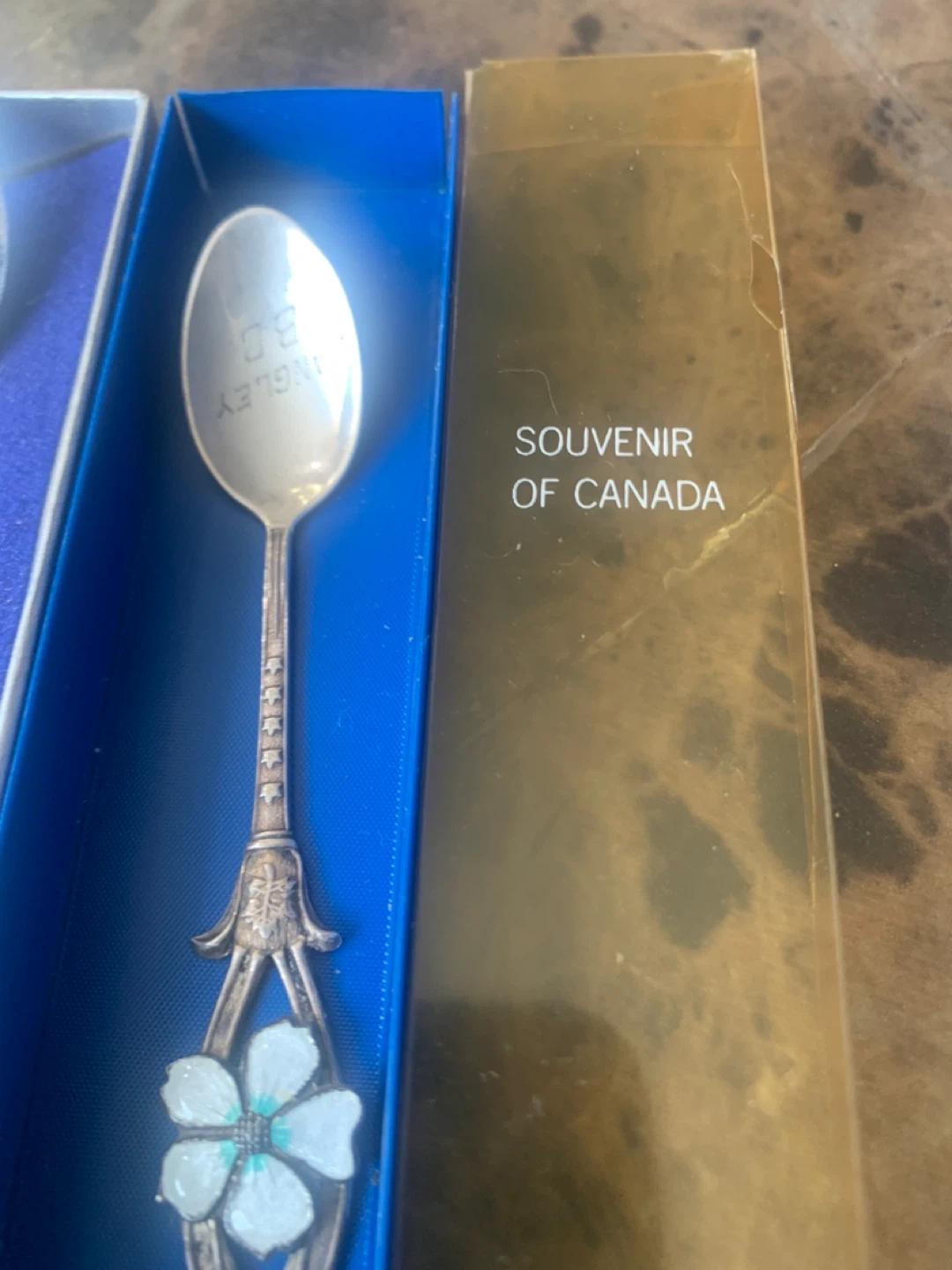 Two souvenir spoons, one featuring Toronto's skyline and the other a floral design with 'Souvenir of Canada' on the packaging. Both come in their original display boxes.